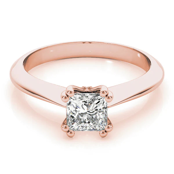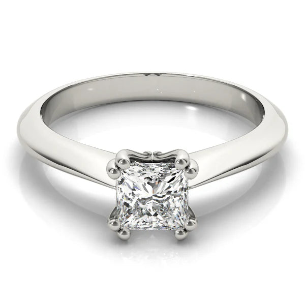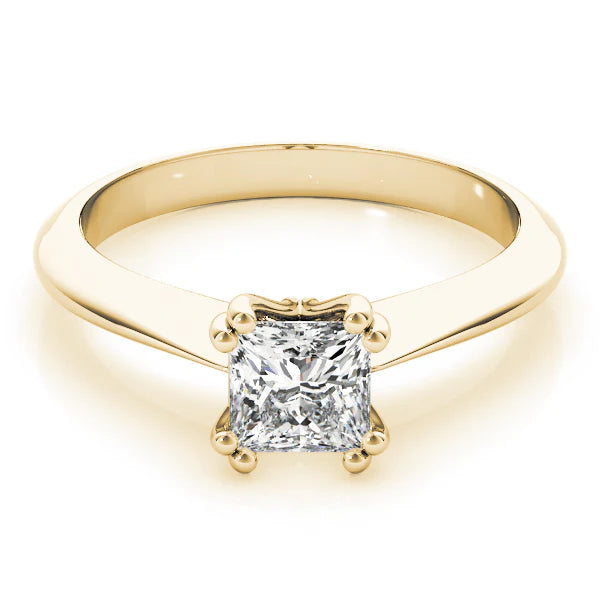 The ring features a classic and elegant design, crafted from polished yellow gold. At its center, it showcases a stunning square-cut diamond, securely held in place by four prongs that accentuate its brilliance and clarity. The band is smooth and slightly tapered, providing a comfortable fit while allowing the diamond to take center stage. This solitaire ring exudes timeless sophistication, making it a perfect choice for engagements or special occasions, where simplicity and elegance are desired.