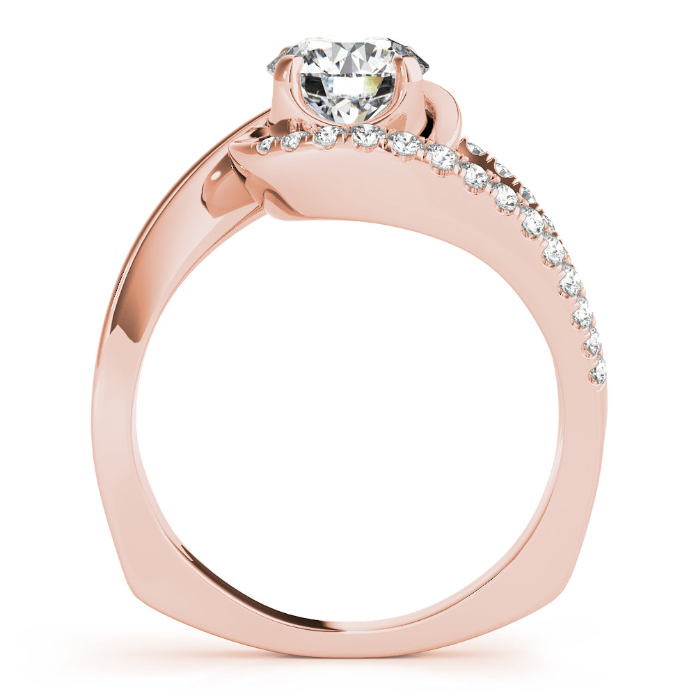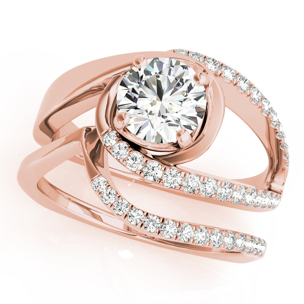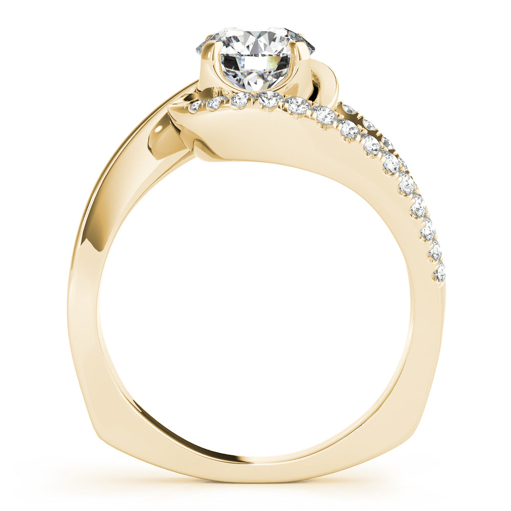 The ring is an elegant piece of jewelry crafted from yellow gold, featuring a stunning design that combines both simplicity and sophistication. At its center, a large, brilliant-cut diamond is securely held in place by four prongs, serving as the focal point of the ring. Surrounding the central diamond is a graceful, swirling band that is encrusted with smaller, round-cut diamonds, adding a touch of sparkle and enhancing the overall brilliance of the piece. The band itself splits into two as it wraps around the finger, creating an open, airy feel that complements the central diamond's prominence. This exquisite ring is a perfect blend of classic elegance and modern design, making it a timeless accessory for any occasion.