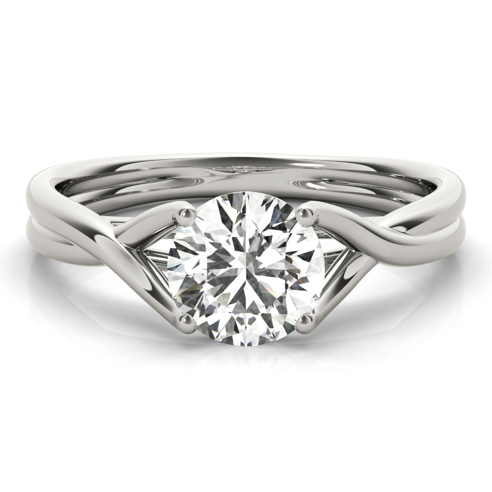 The ring features a sleek and elegant design, crafted from polished white gold or platinum, which gives it a sophisticated and timeless appeal. At its center, the ring showcases a single, stunning round-cut diamond, held securely in place by four prongs that allow maximum light to pass through, enhancing its brilliance and sparkle. The band itself is gracefully twisted, adding a modern and unique touch to the classic solitaire setting. This ring is a perfect blend of contemporary style and traditional elegance, making it an ideal choice for an engagement or special occasion.