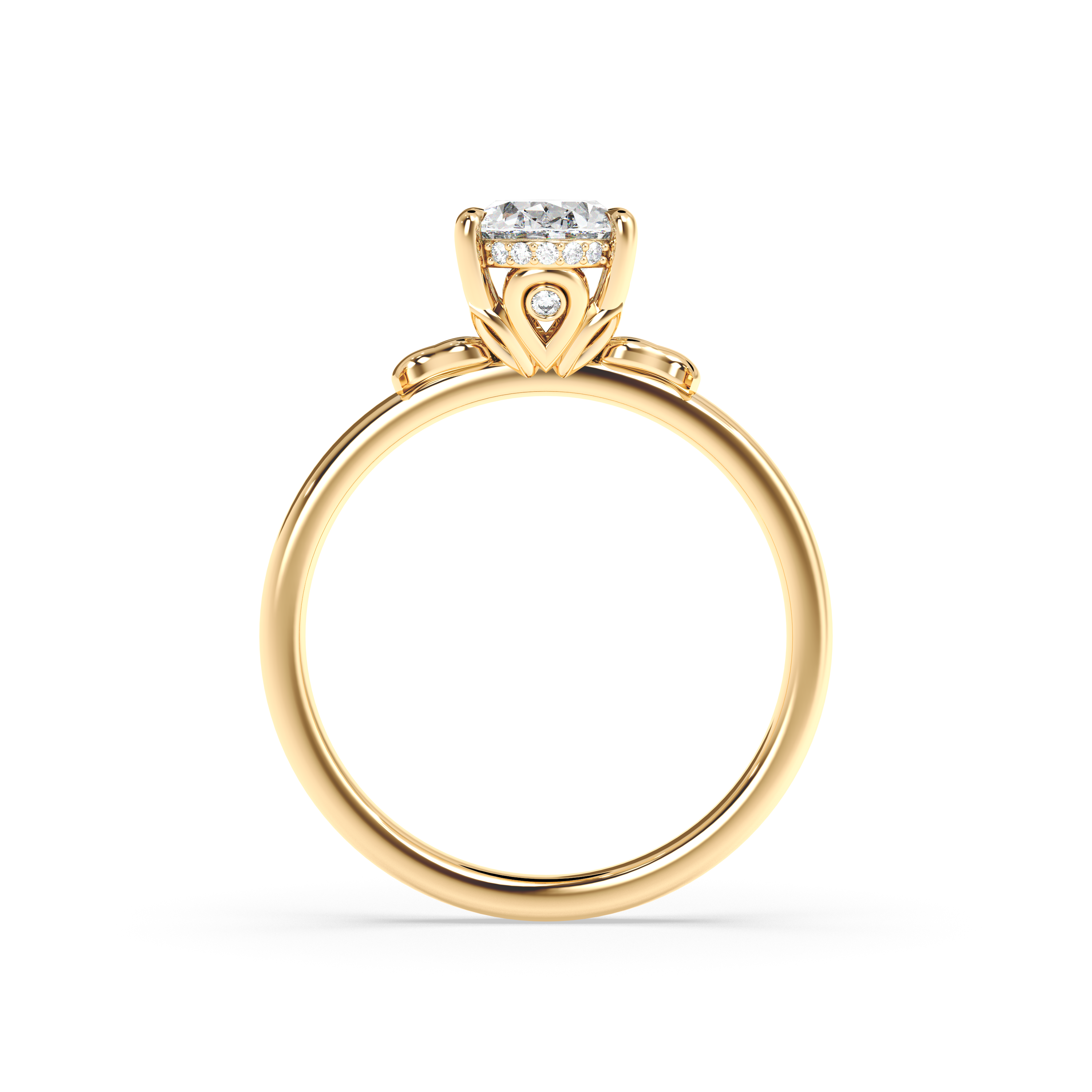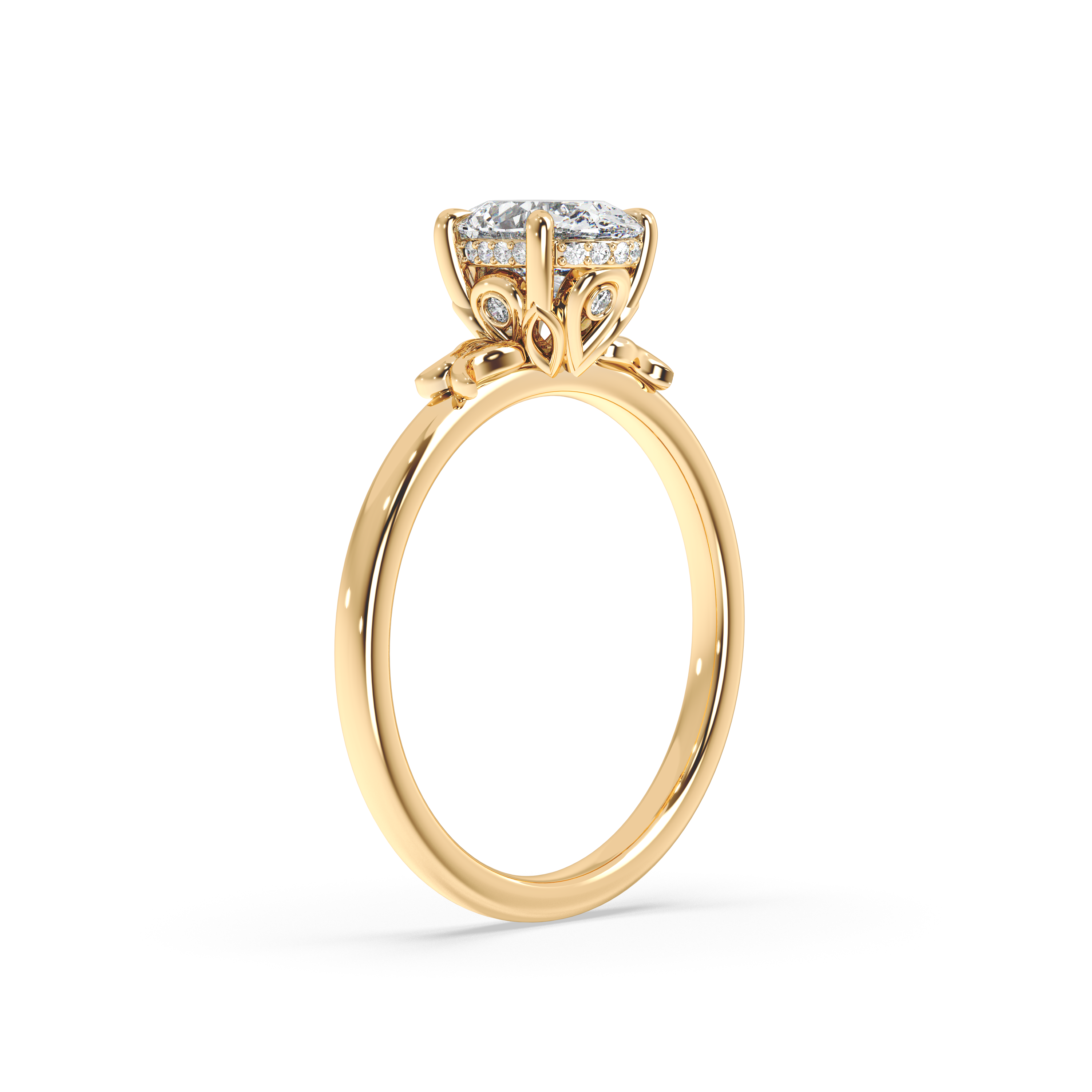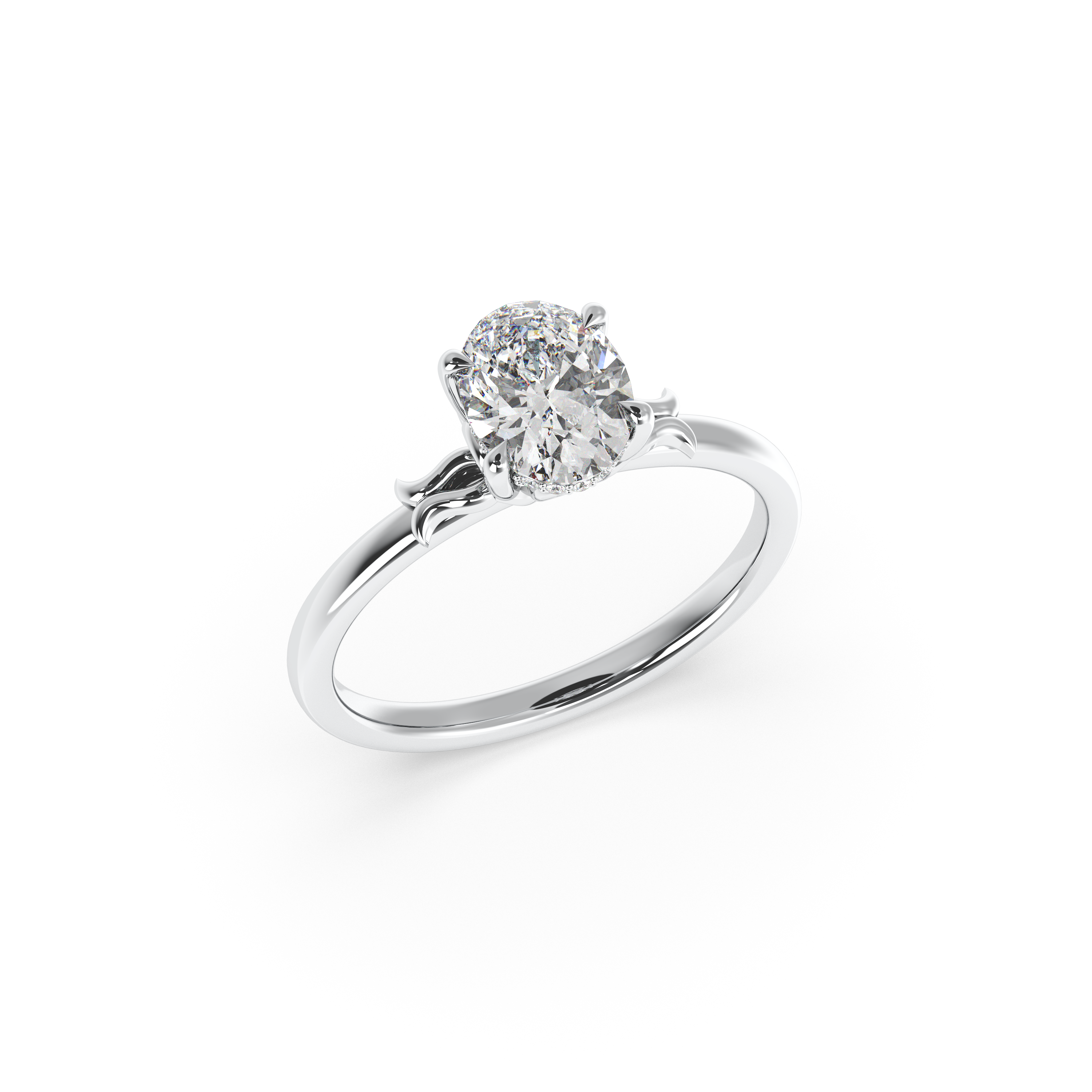 A bold statement of elegance and individuality, this ring features a brilliant oval center diamond, set in a refined four-prong claw setting. From the side, the silhouette reveals its true character—arching, flame-like shoulders reach up to meet the stone, while beneath the crown, Protea-inspired petal details cradle two hidden diamonds. Every angle tells a story of strength, artistry, and passion. With 3 diamonds in total, this design is for those who appreciate beauty with presence and meaning.