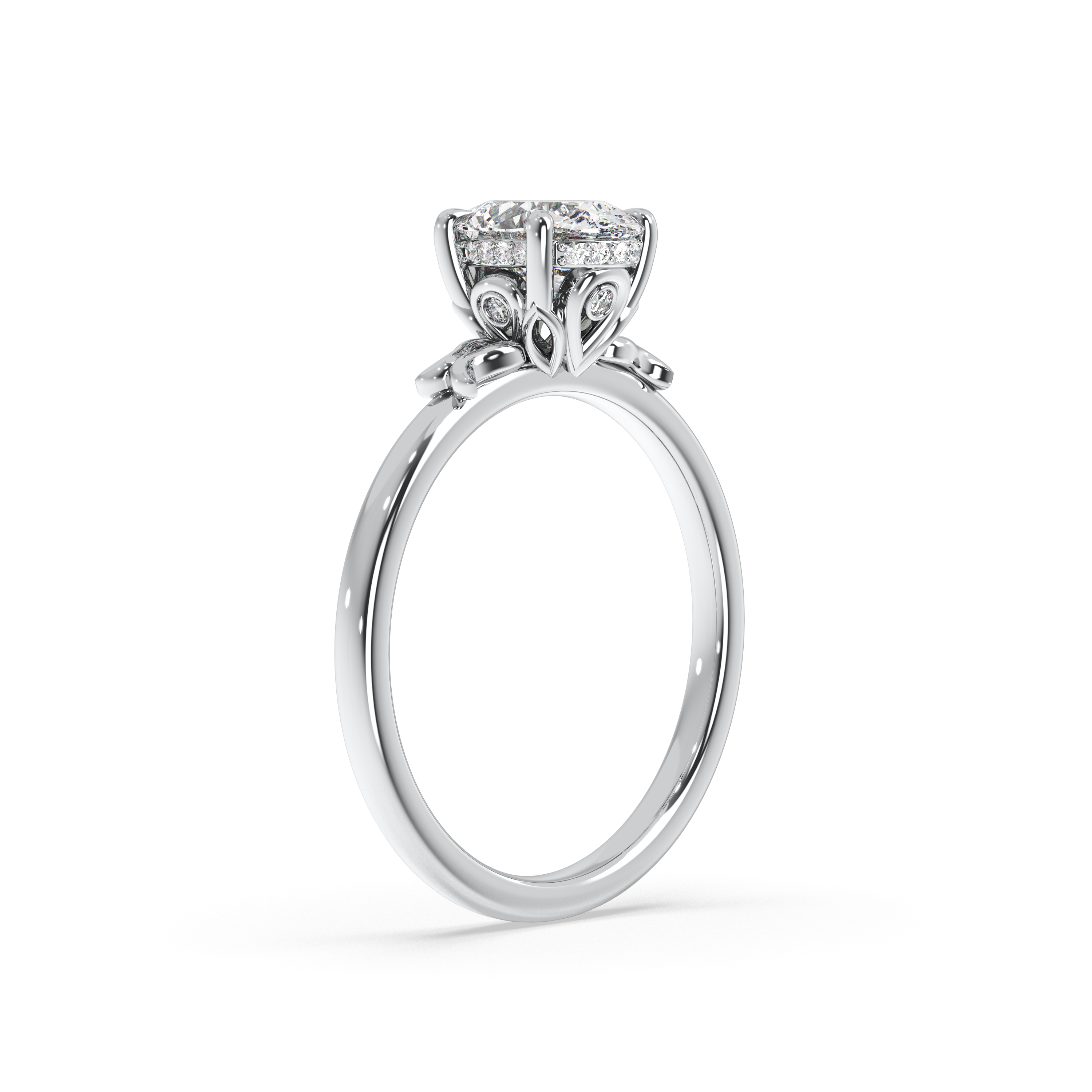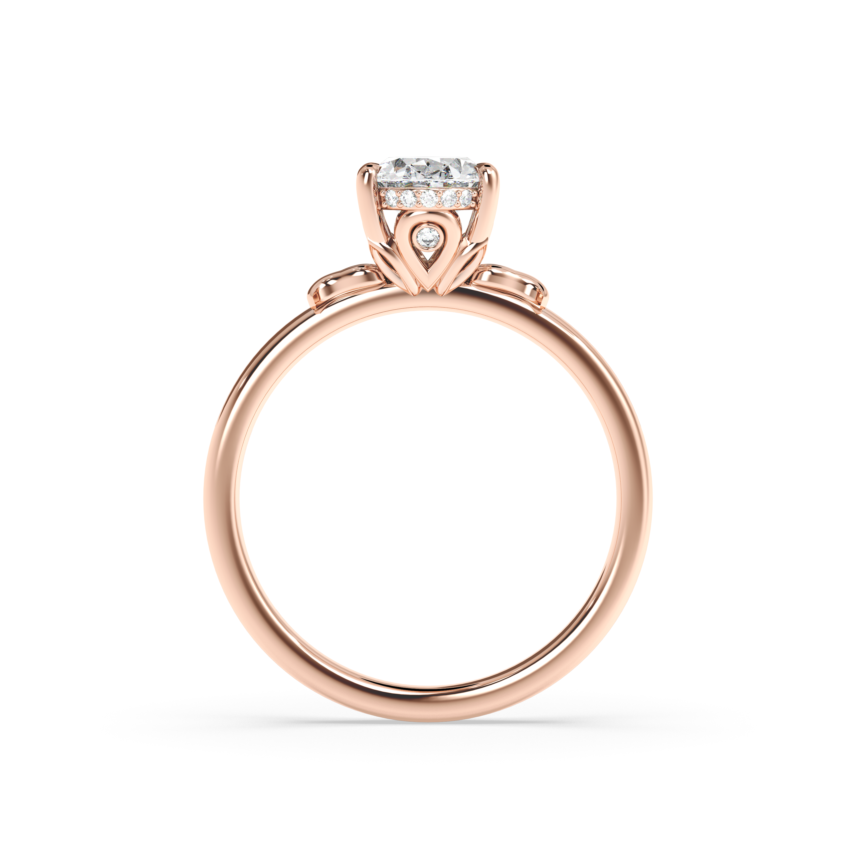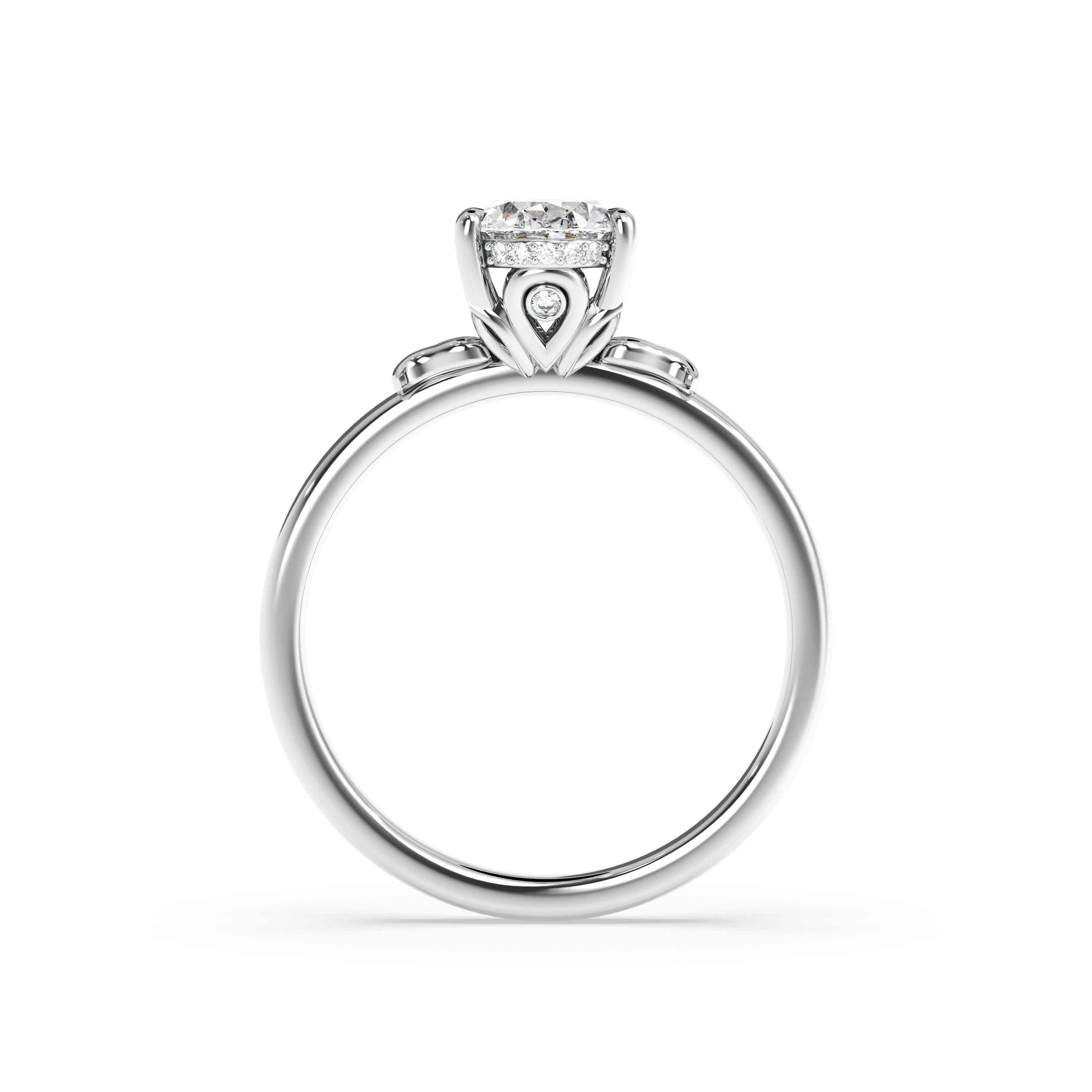 A bold statement of elegance and individuality, this ring features a brilliant oval center diamond, set in a refined four-prong claw setting. From the side, the silhouette reveals its true character—arching, flame-like shoulders reach up to meet the stone, while beneath the crown, Protea-inspired petal details cradle two hidden diamonds. Every angle tells a story of strength, artistry, and passion. With 3 diamonds in total, this design is for those who appreciate beauty with presence and meaning.