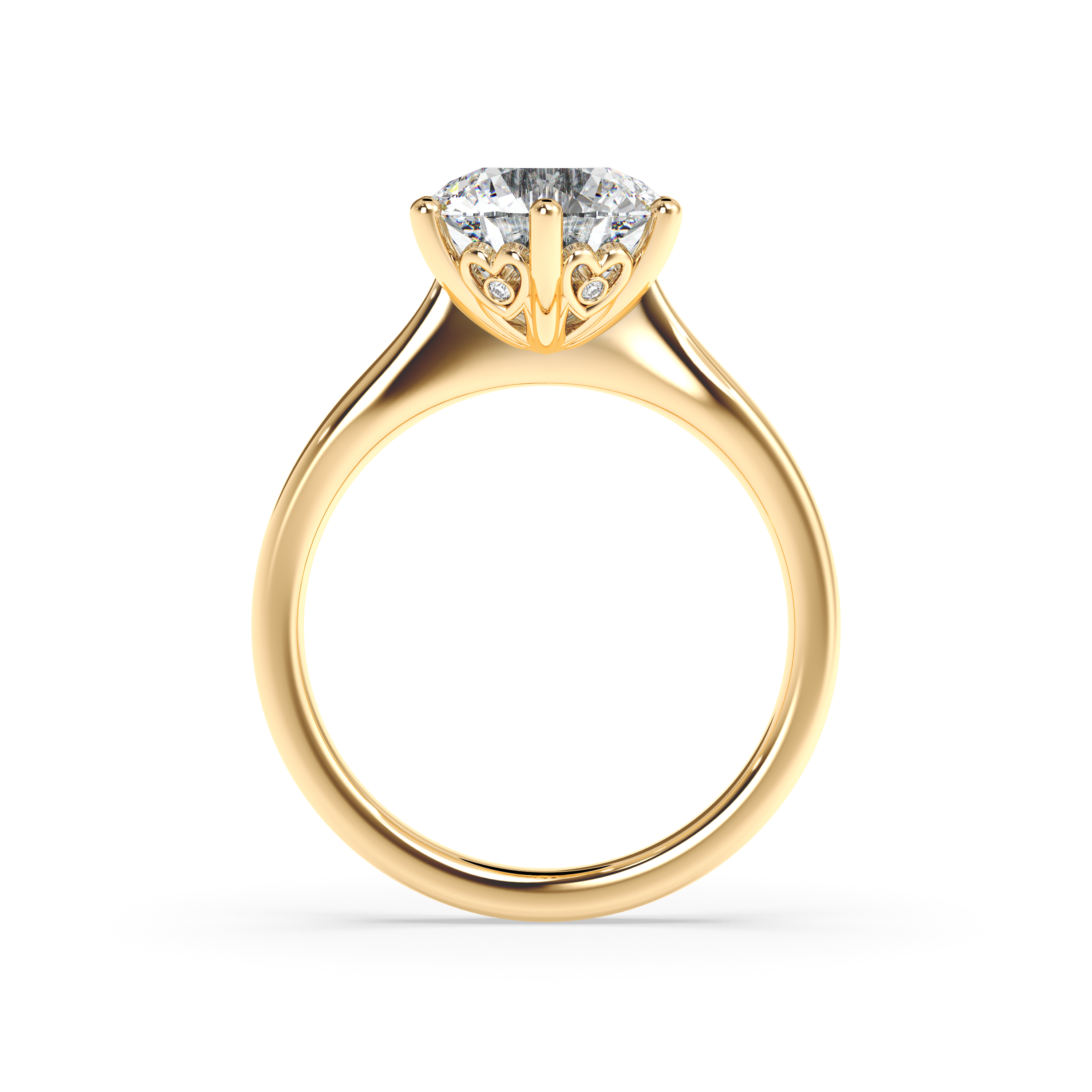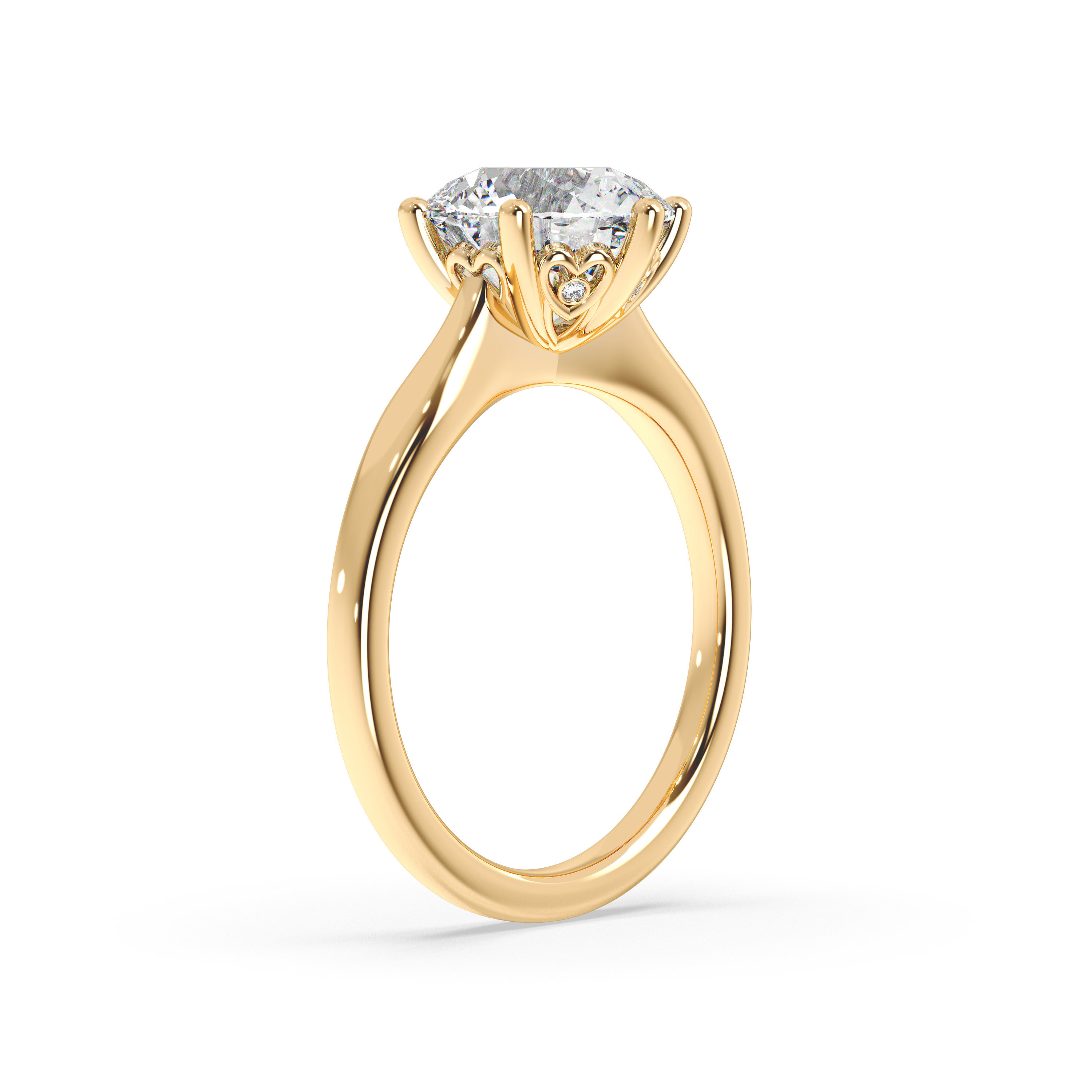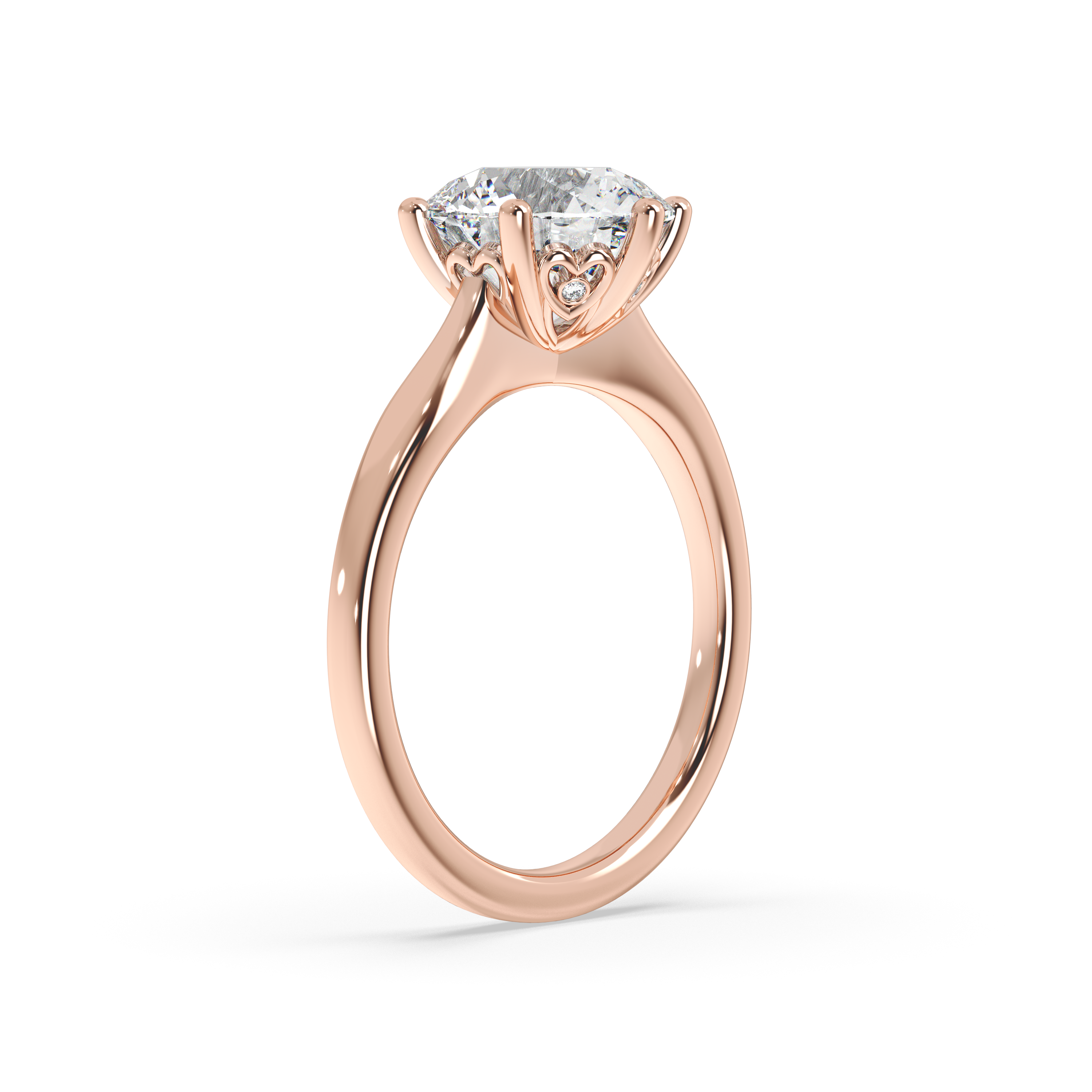 A bold statement of elegance and individuality, this ring features a brilliant oval center diamond, set in a refined four-prong claw setting. From the side, the silhouette reveals its true character—arching, flame-like shoulders reach up to meet the stone, while beneath the crown, Protea-inspired petal details cradle two hidden diamonds. Every angle tells a story of strength, artistry, and passion. With 3 diamonds in total, this design is for those who appreciate beauty with presence and meaning.
