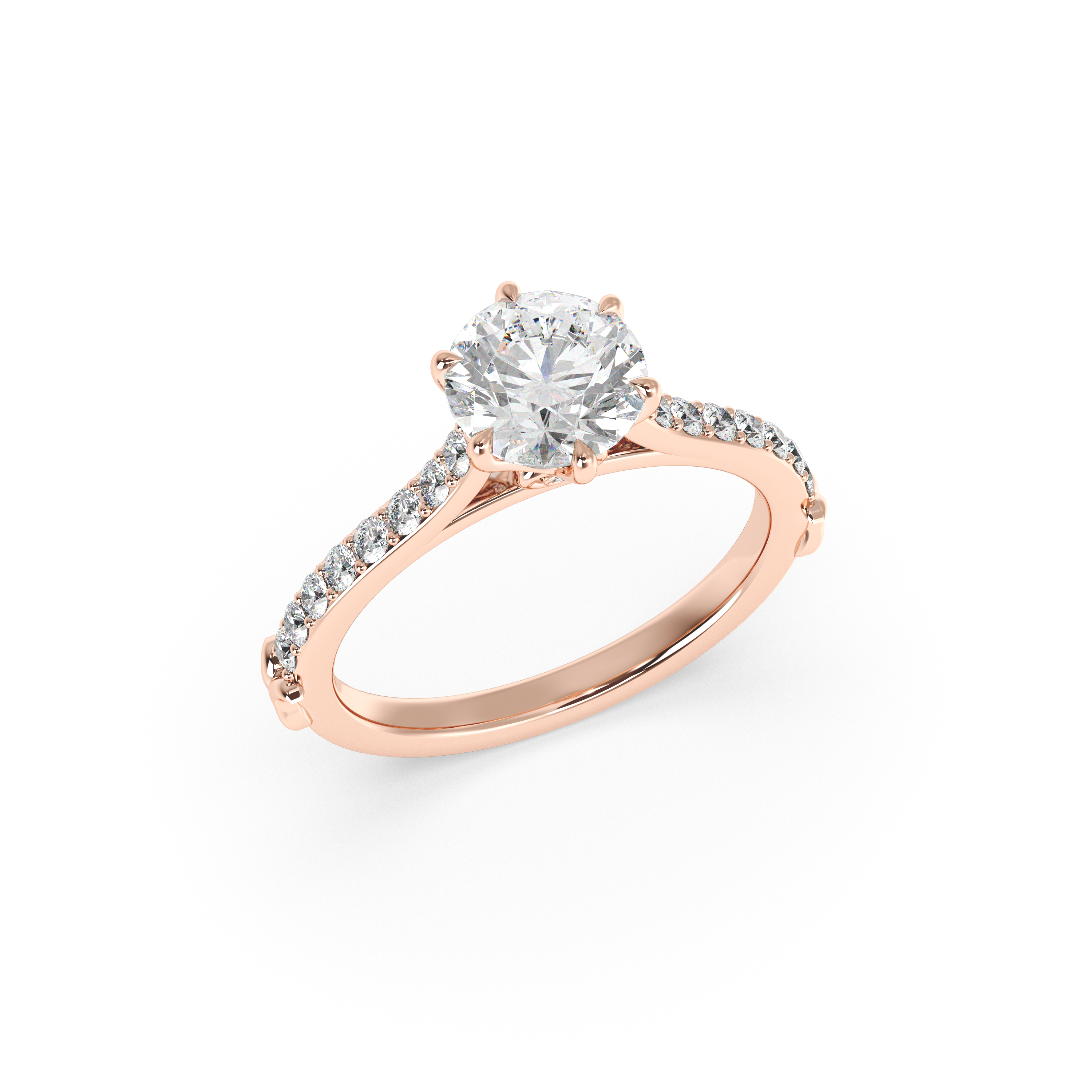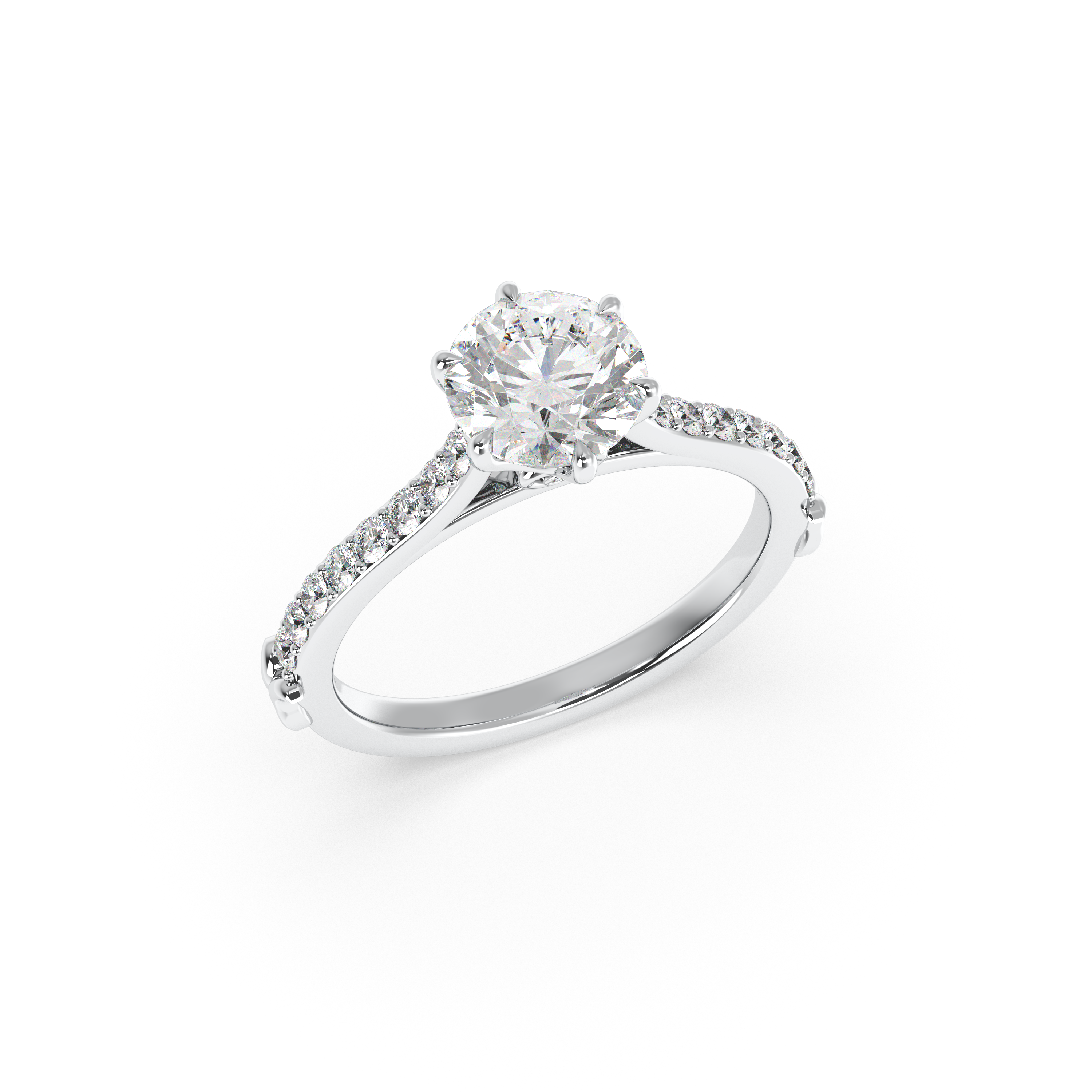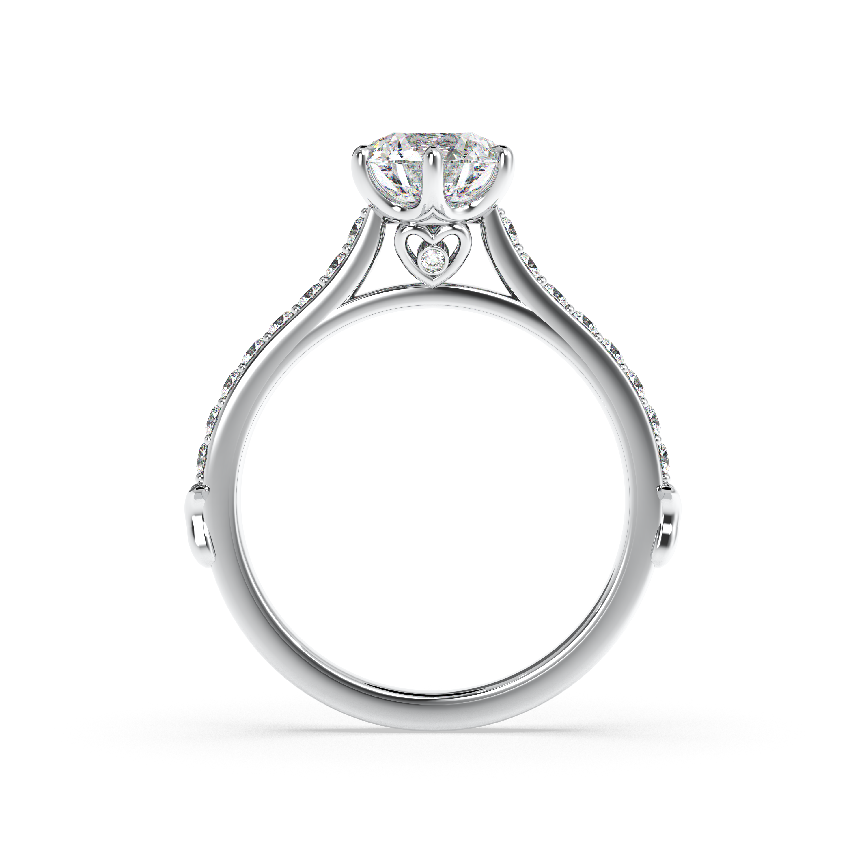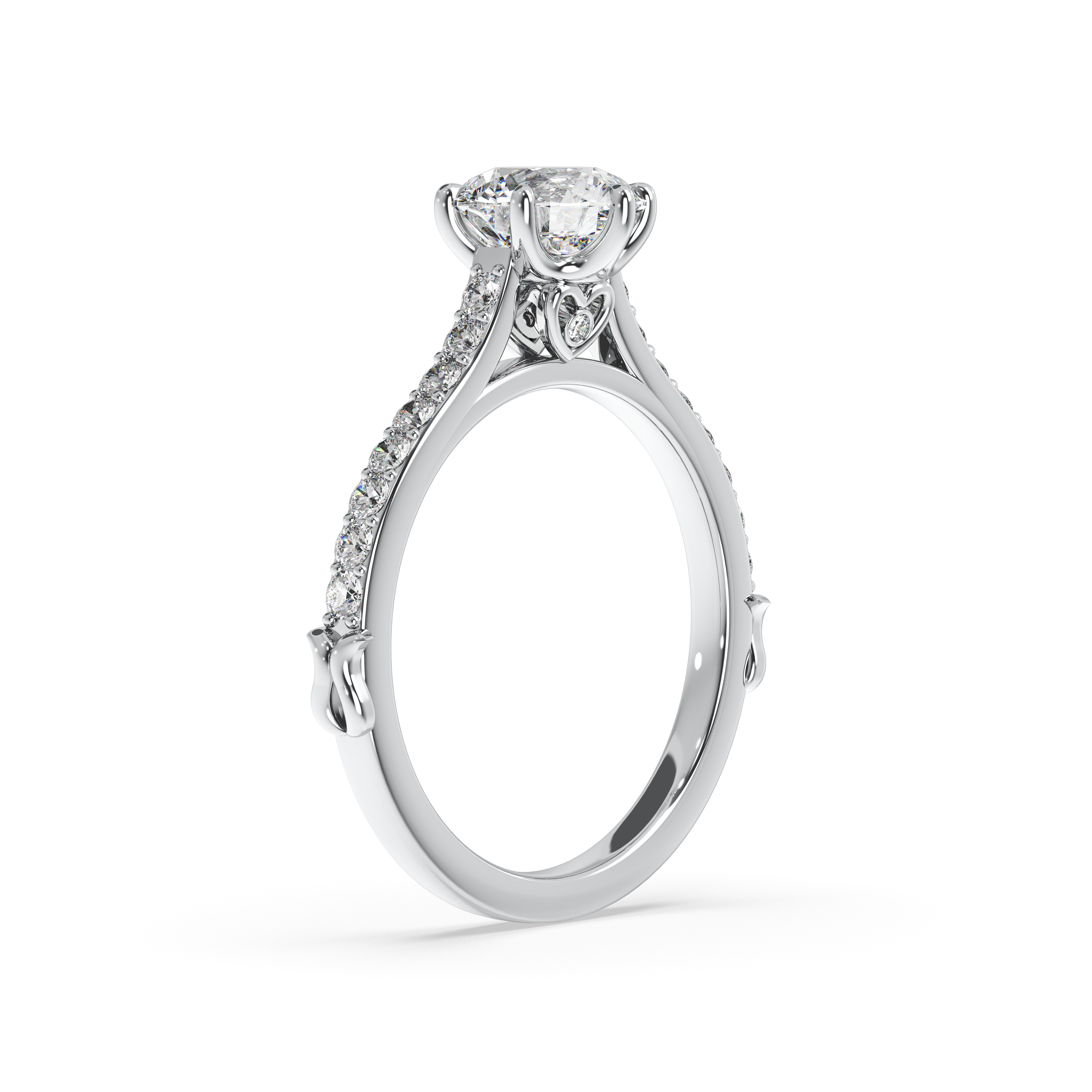 This enchanting design blends romance, refinement, and symbolism in one breathtaking piece. Featuring a hidden heart detail beneath the center diamond, it reflects a deep and personal love story. The band is adorned with 20 pavé-set diamonds that bring a subtle shimmer from every angle, while delicate leaf-like accents at the base nod to nature and new beginnings. A perfect blend of sentiment and sophistication, this ring is a timeless expression of commitment.