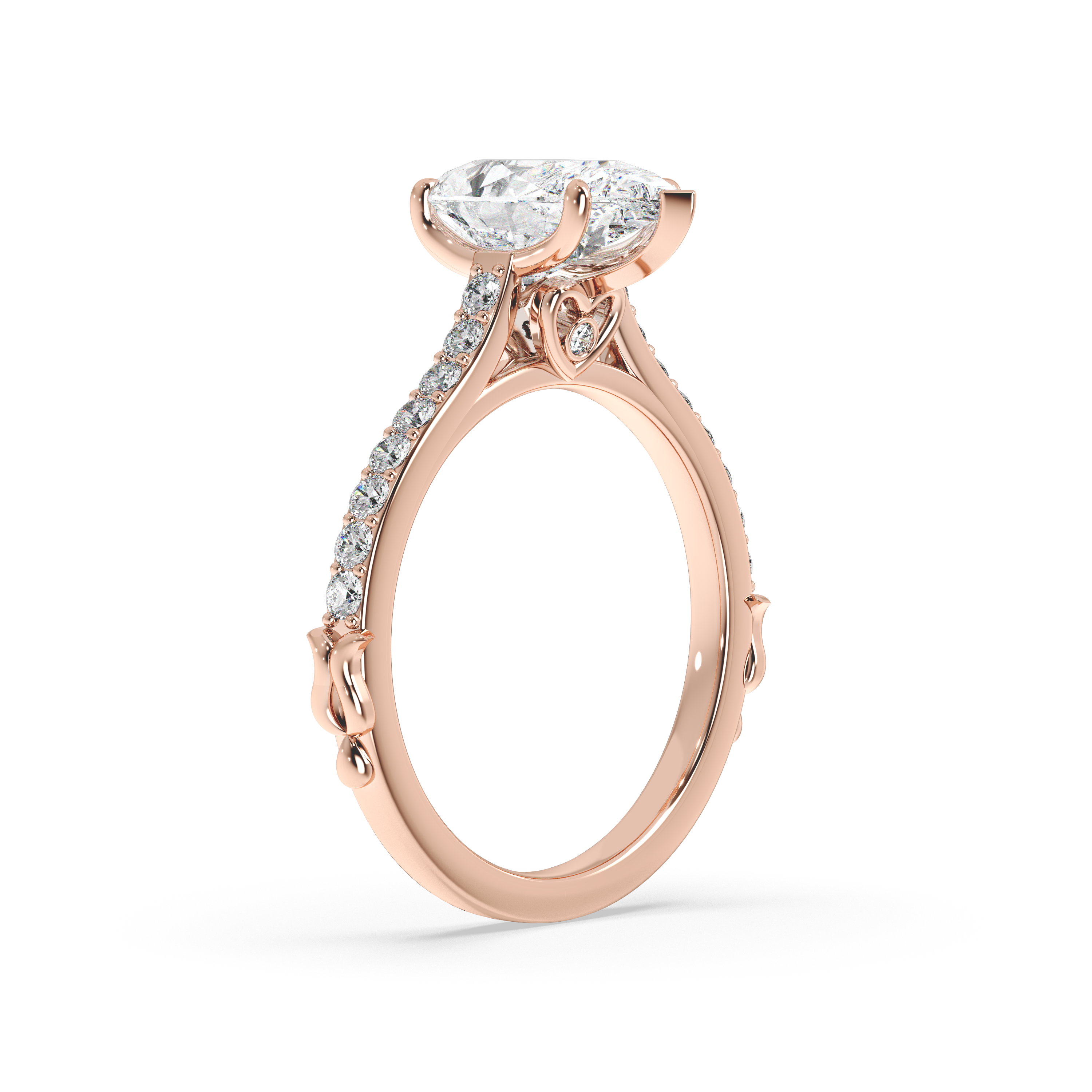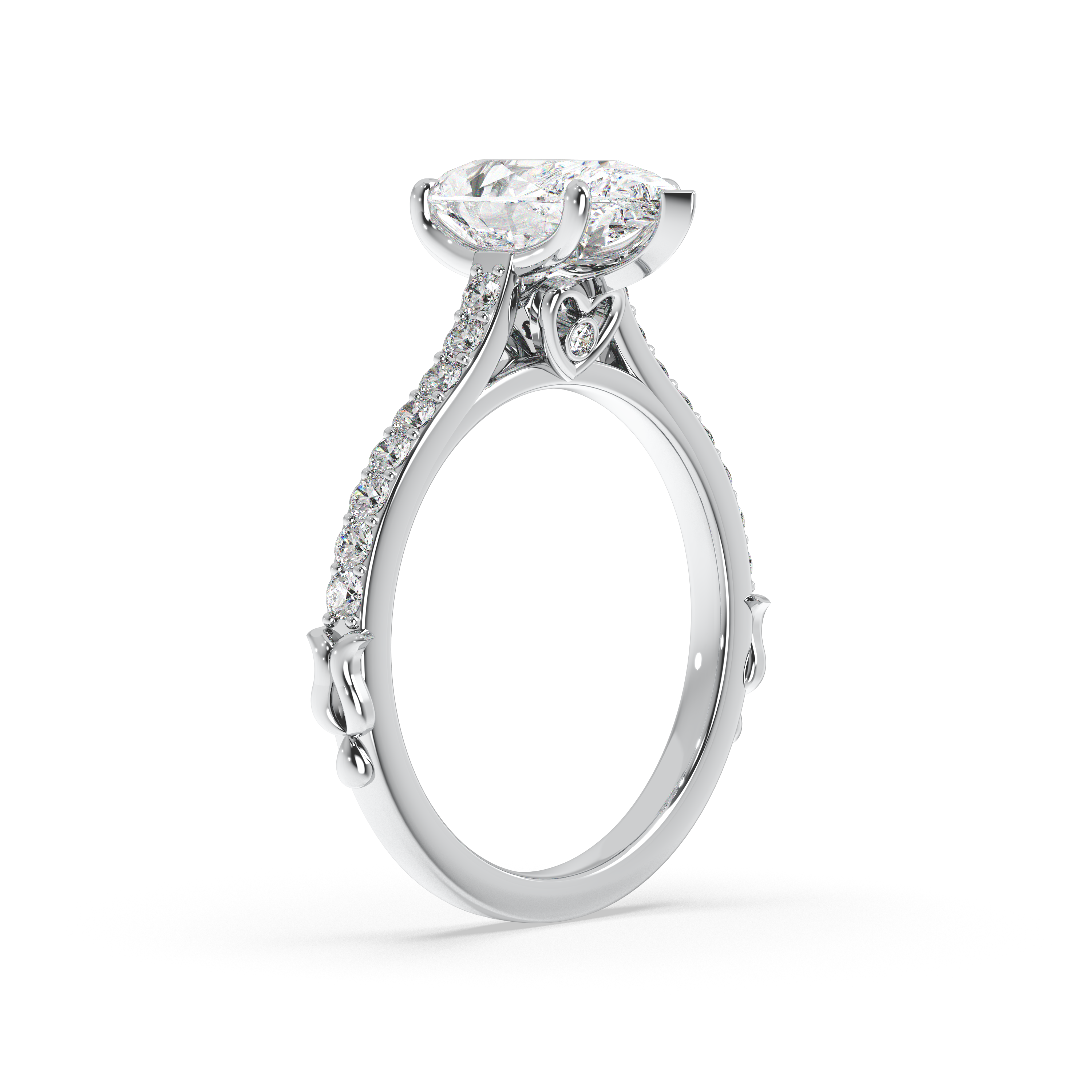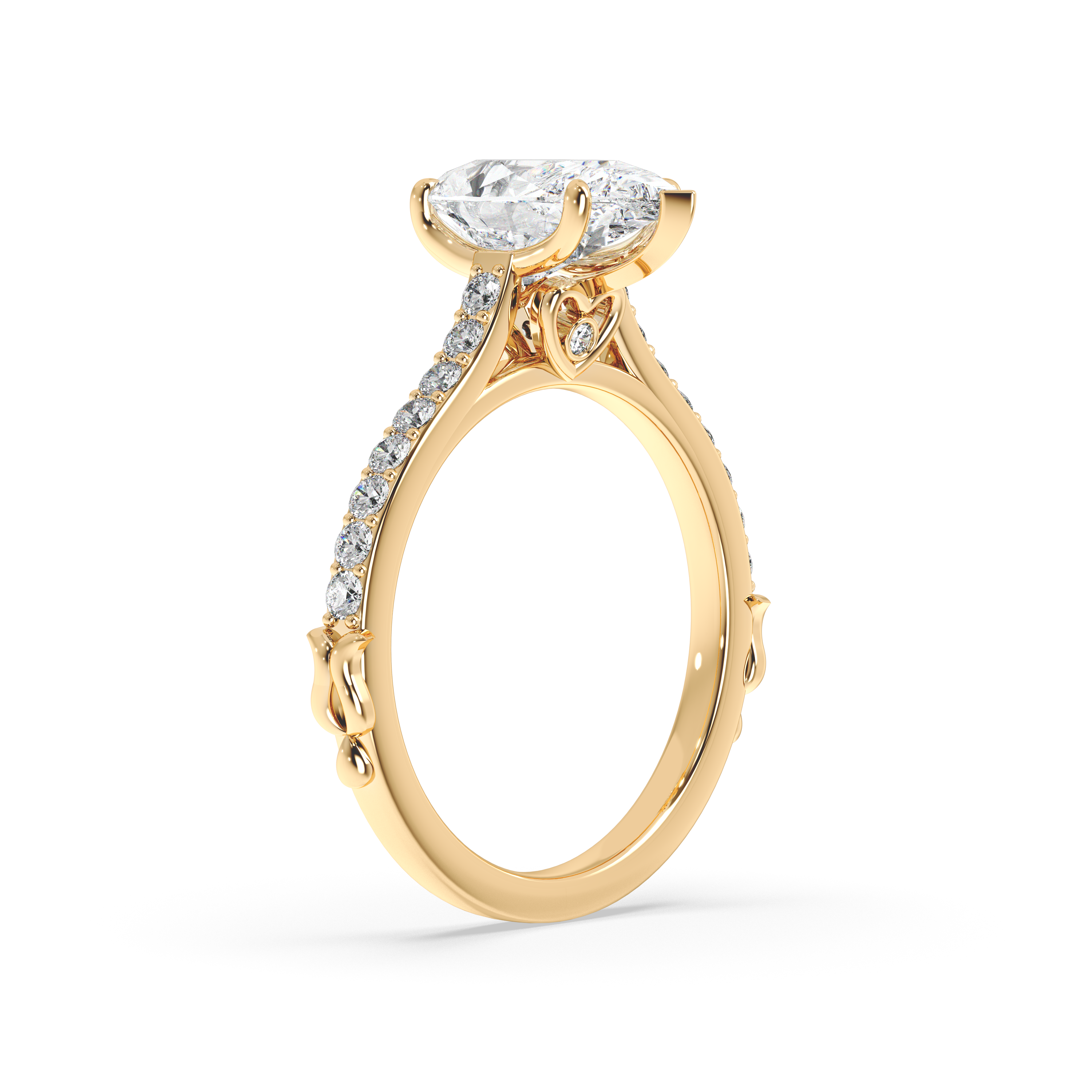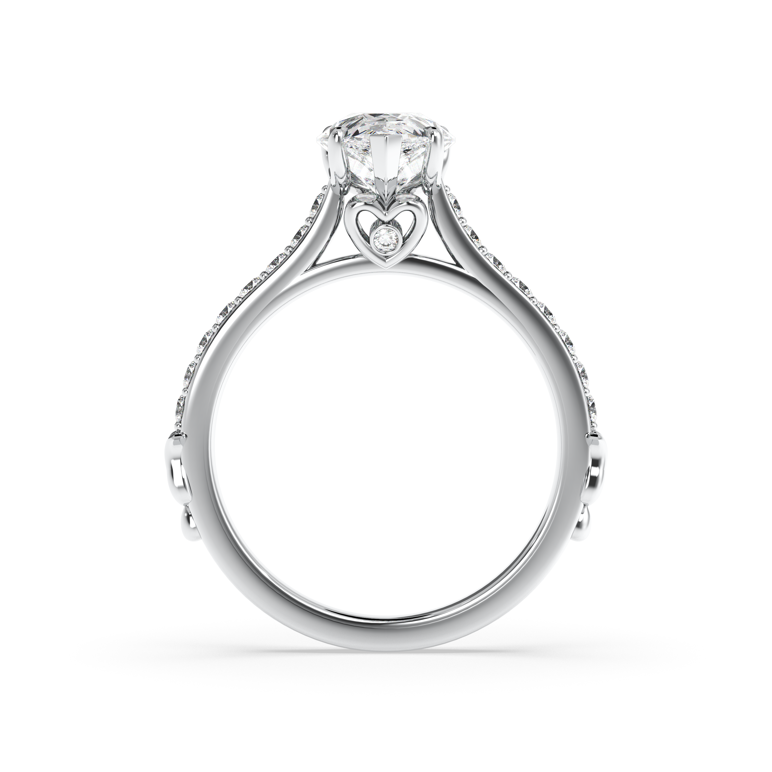 Effortlessly elegant and deeply symbolic, this ring features a pear-shaped center diamond elevated on a slender pavé band. Sixteen hand-set diamonds line the shoulders, drawing the eye to the brilliance of the centerpiece. Hidden beneath the crown, two sculpted hearts cradle a diamond on each side—a quiet expression of love only visible to those who look closer. Further down the band, Protea bud details add a graceful, modern nod to natural beauty and South African heritage. With 19 diamonds in total, this ring blends classic romance with thoughtful, contemporary design.