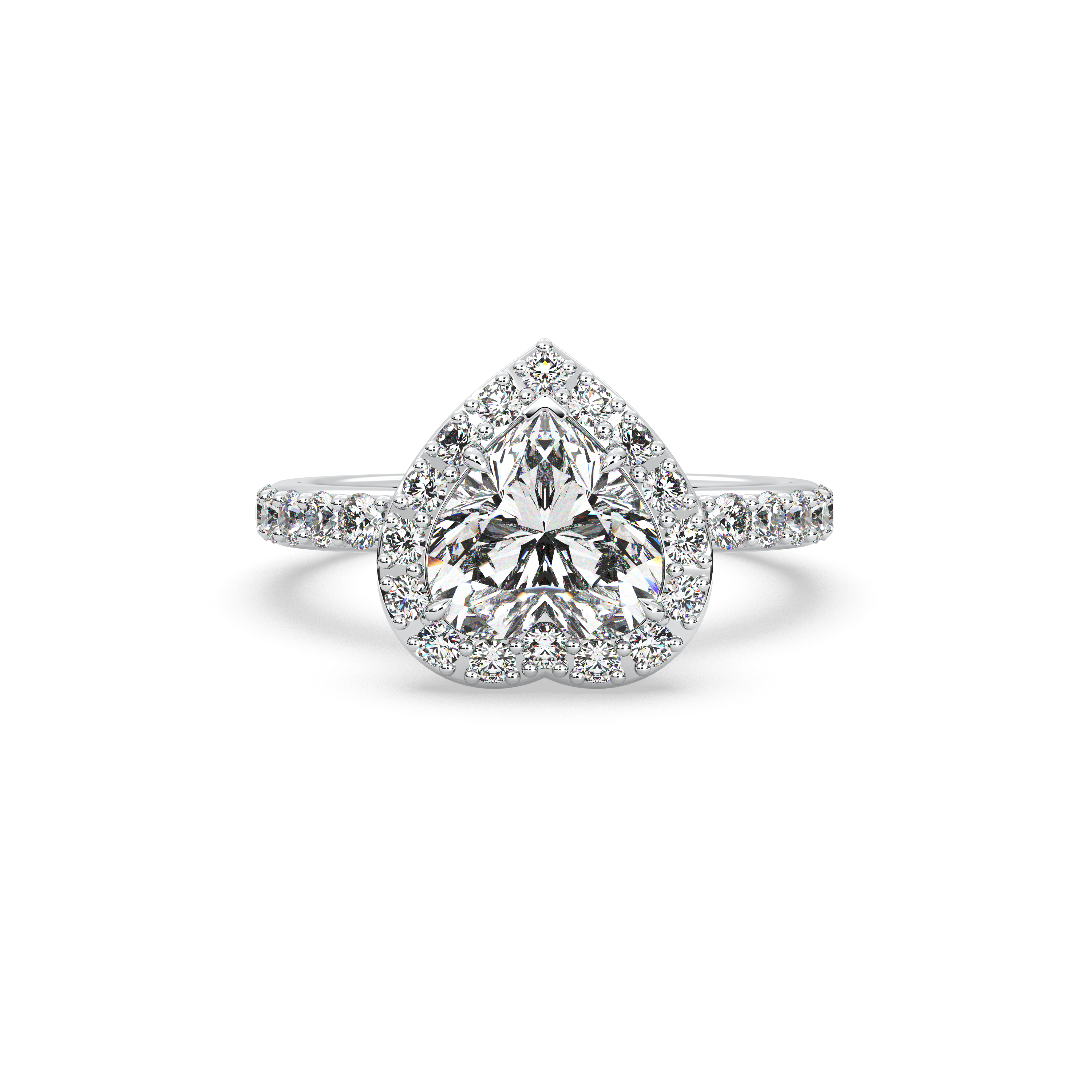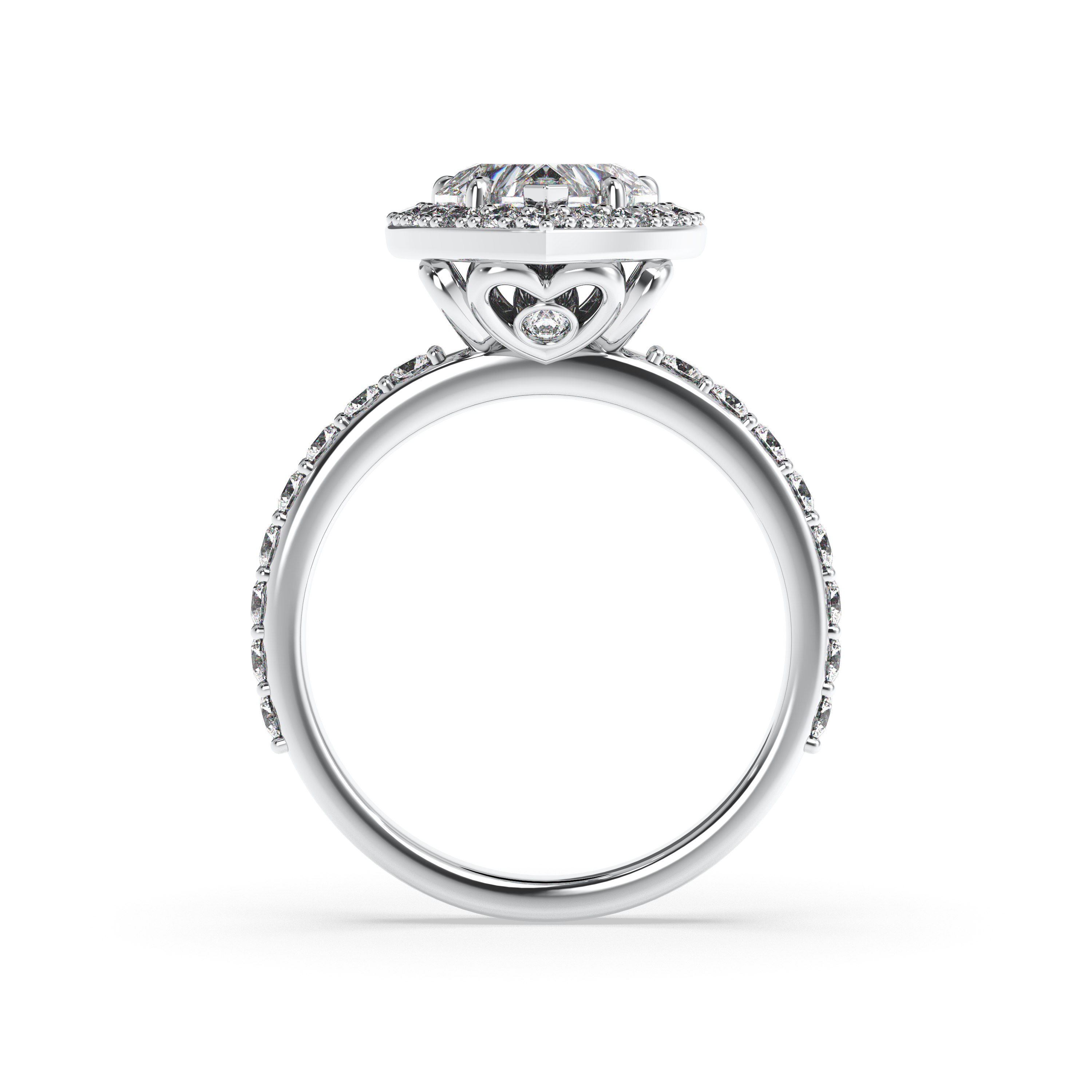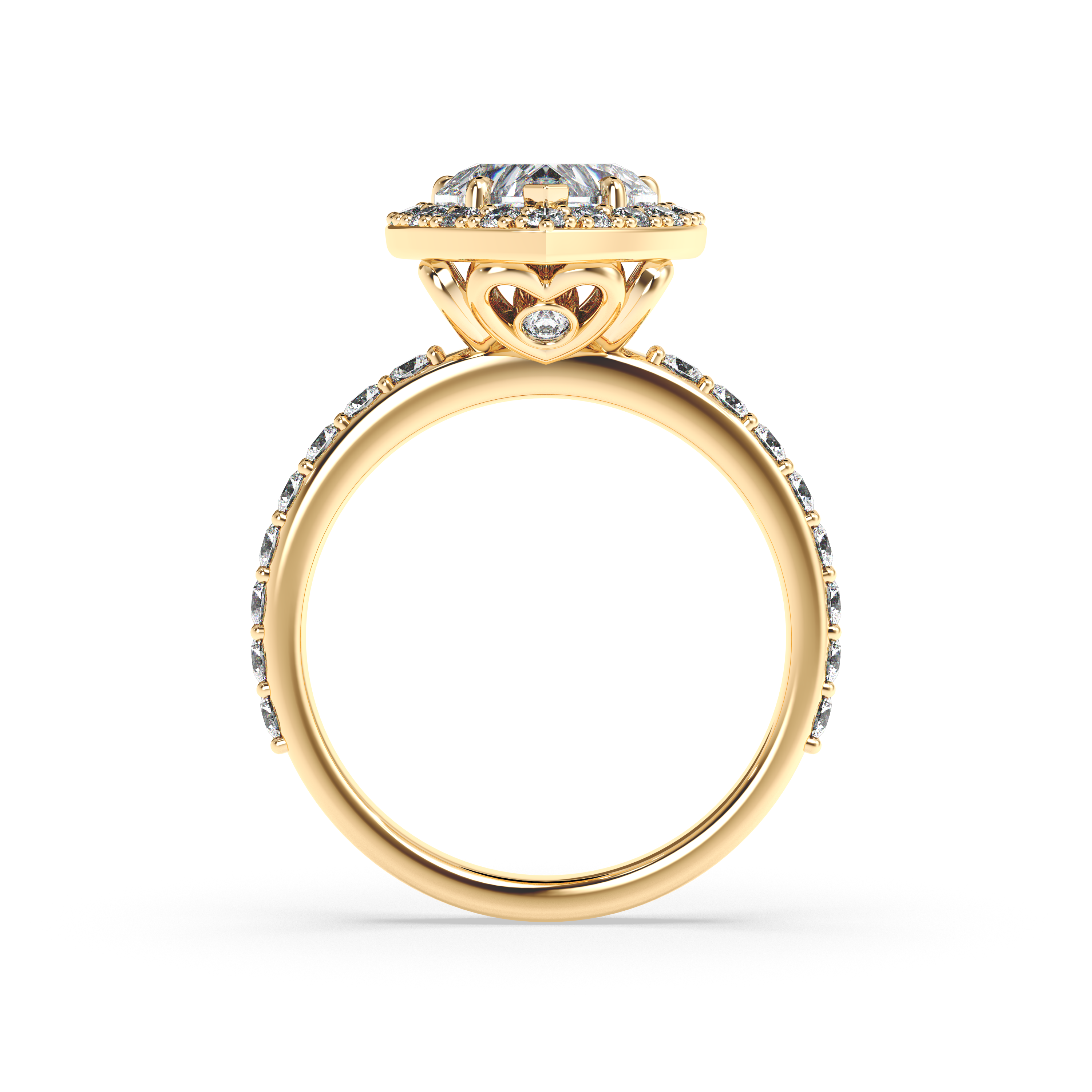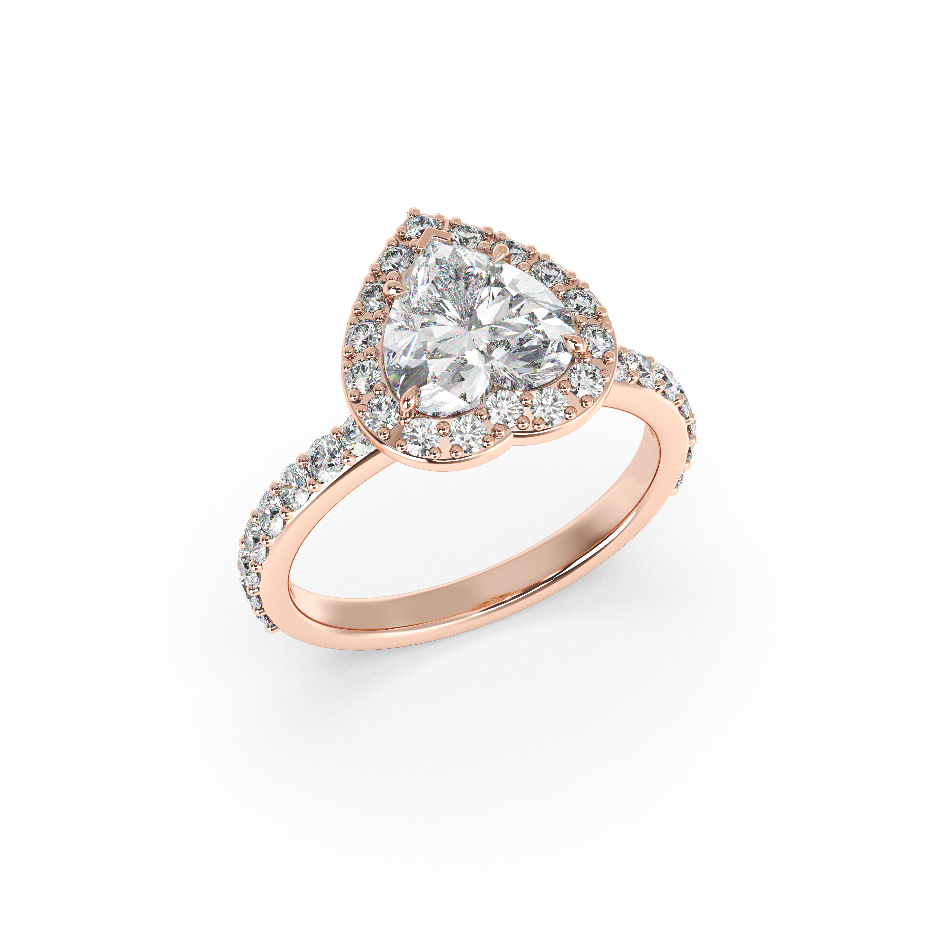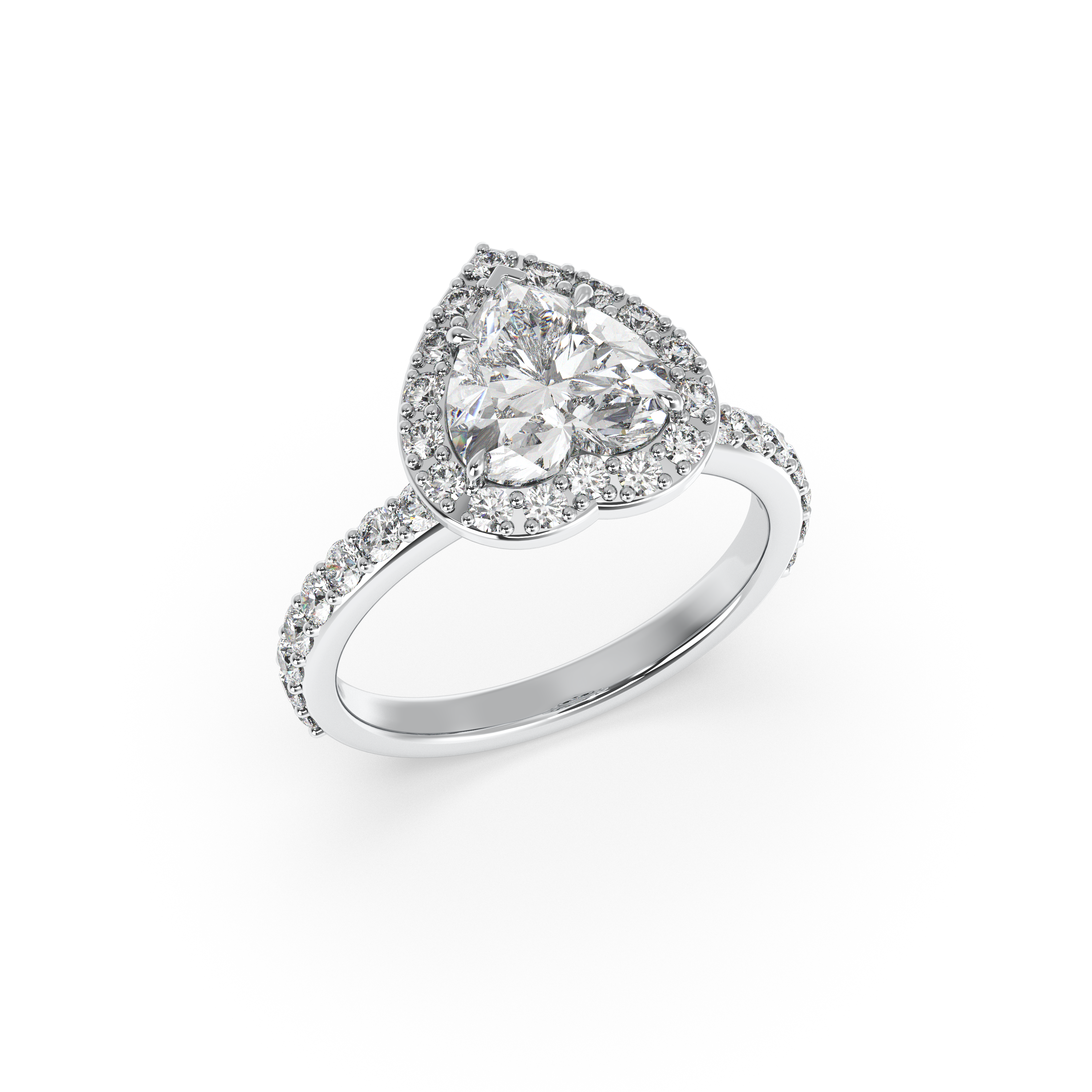 Refined and symbolic, this design features a pear-shaped center diamond framed by a precise halo of 20 round diamonds. The band is lined with 16 accent stones, creating a seamless transition to the center. Beneath the setting, two sculpted hearts cradle the diamond from below—a hidden expression of sentiment. With 37 diamonds in total, this piece balances quiet detail with timeless form.