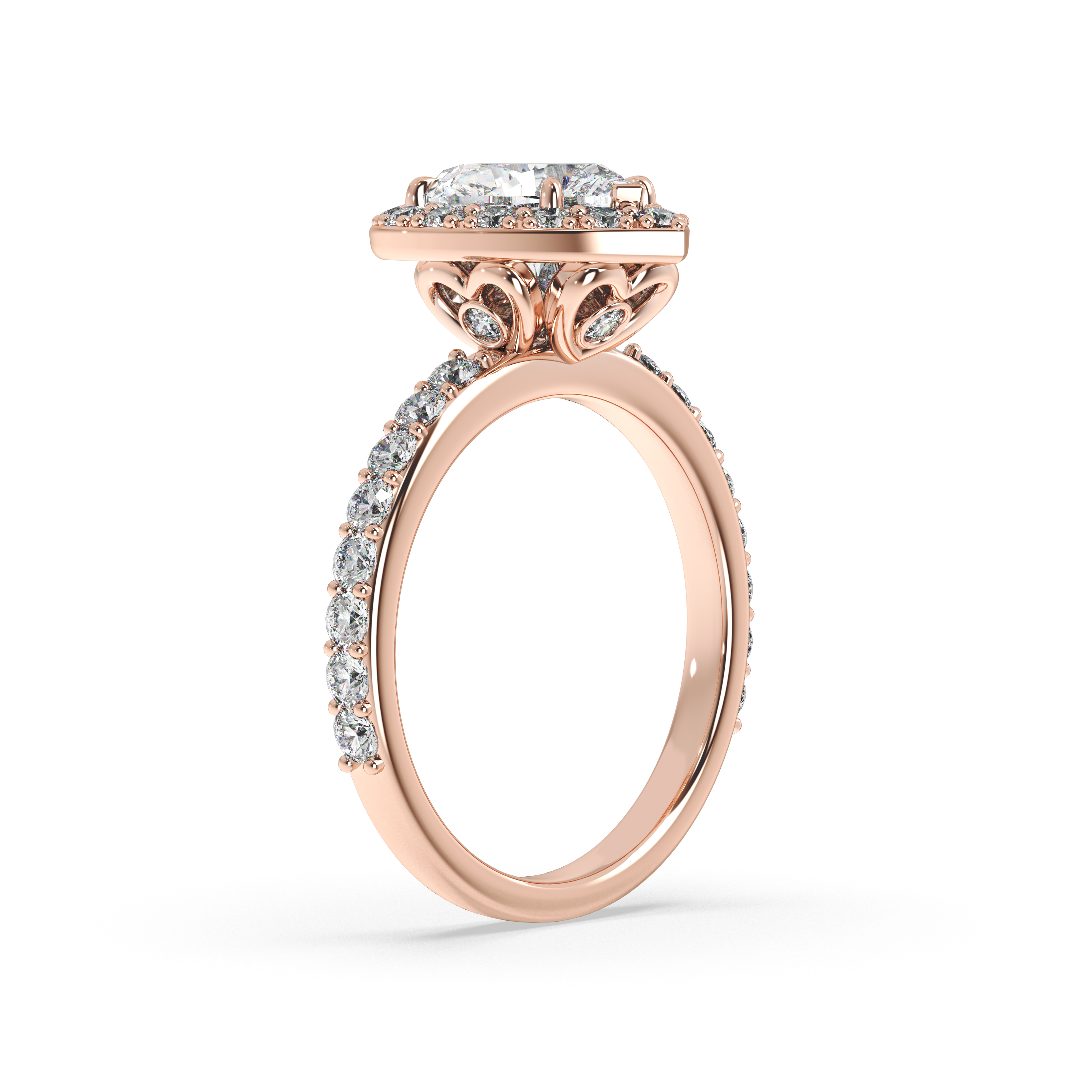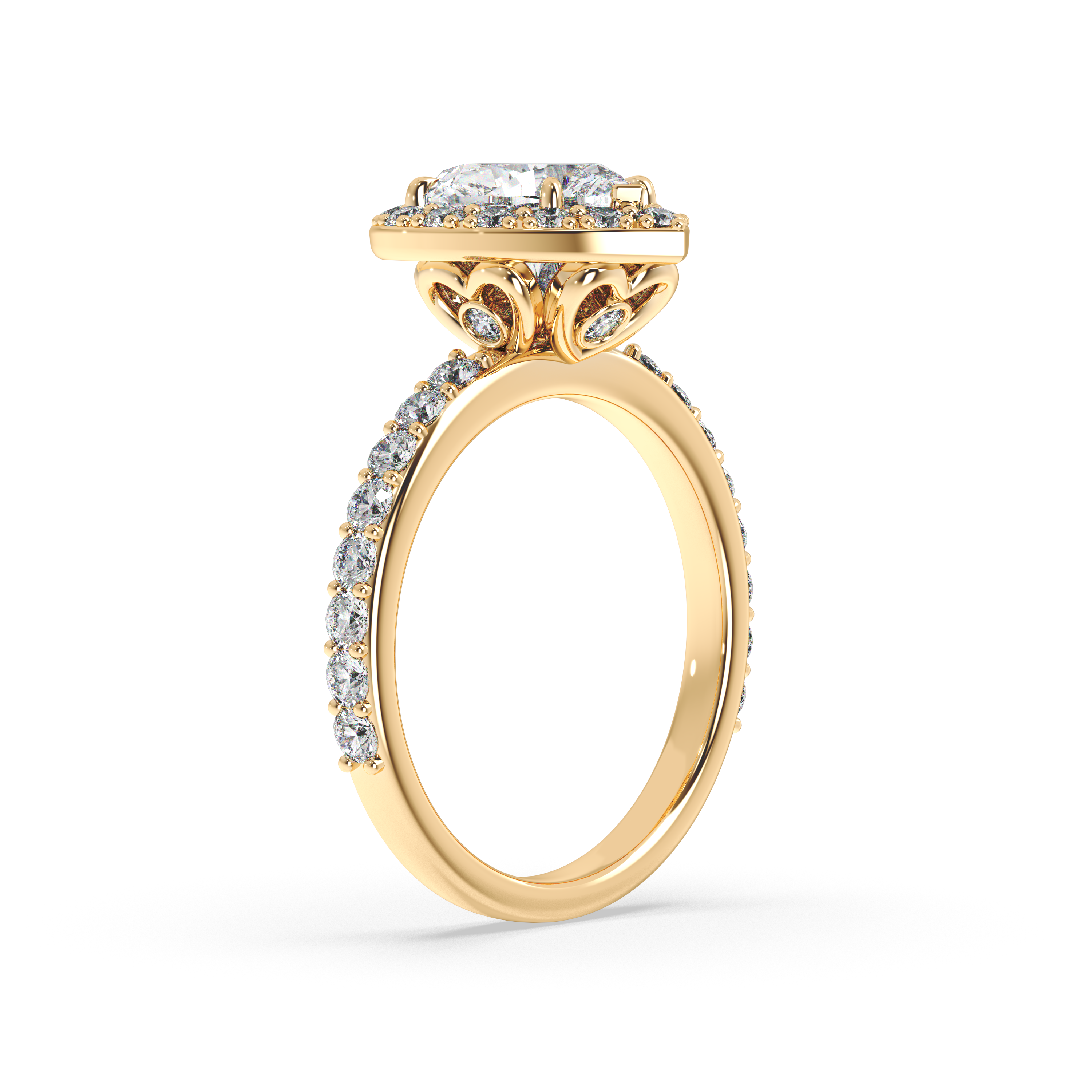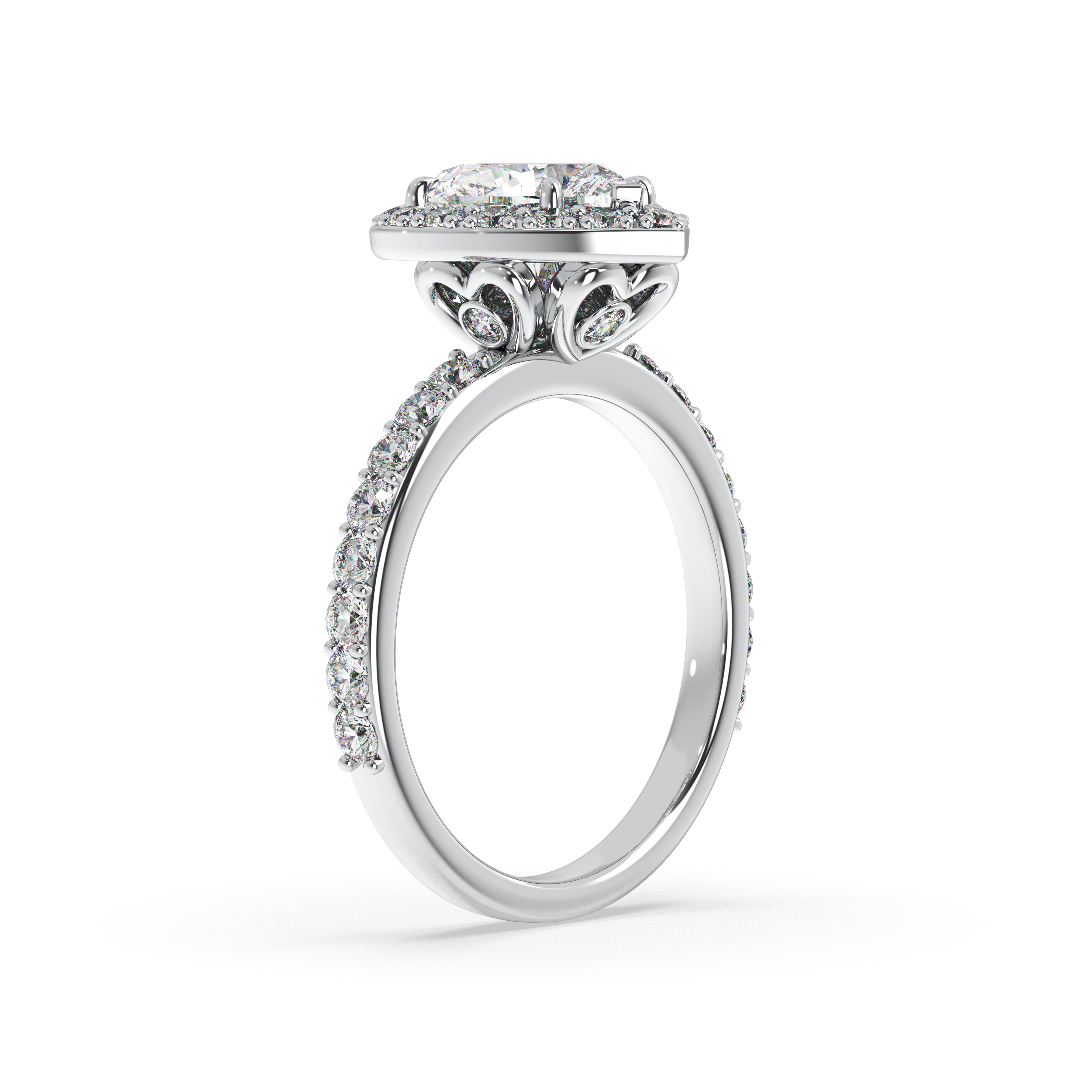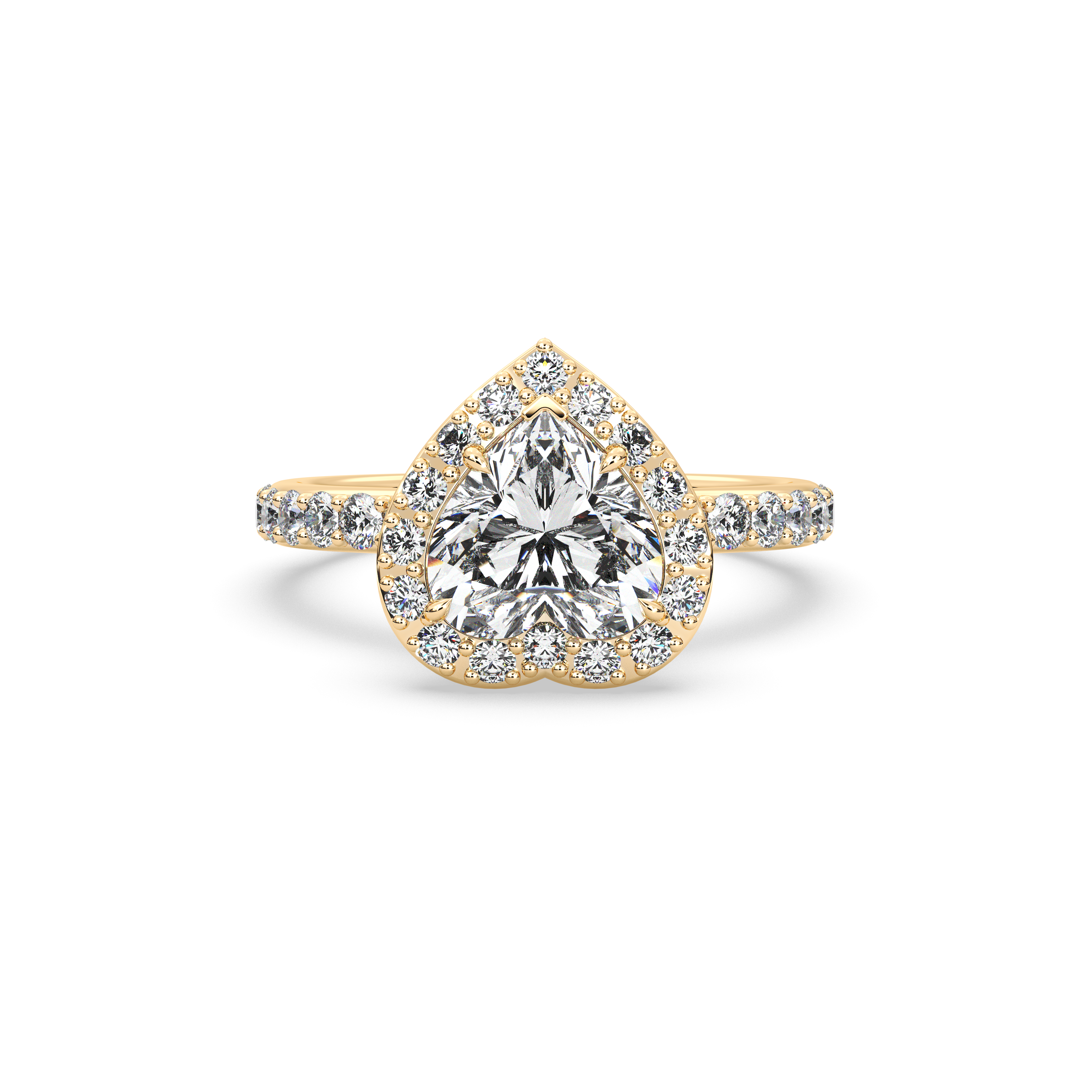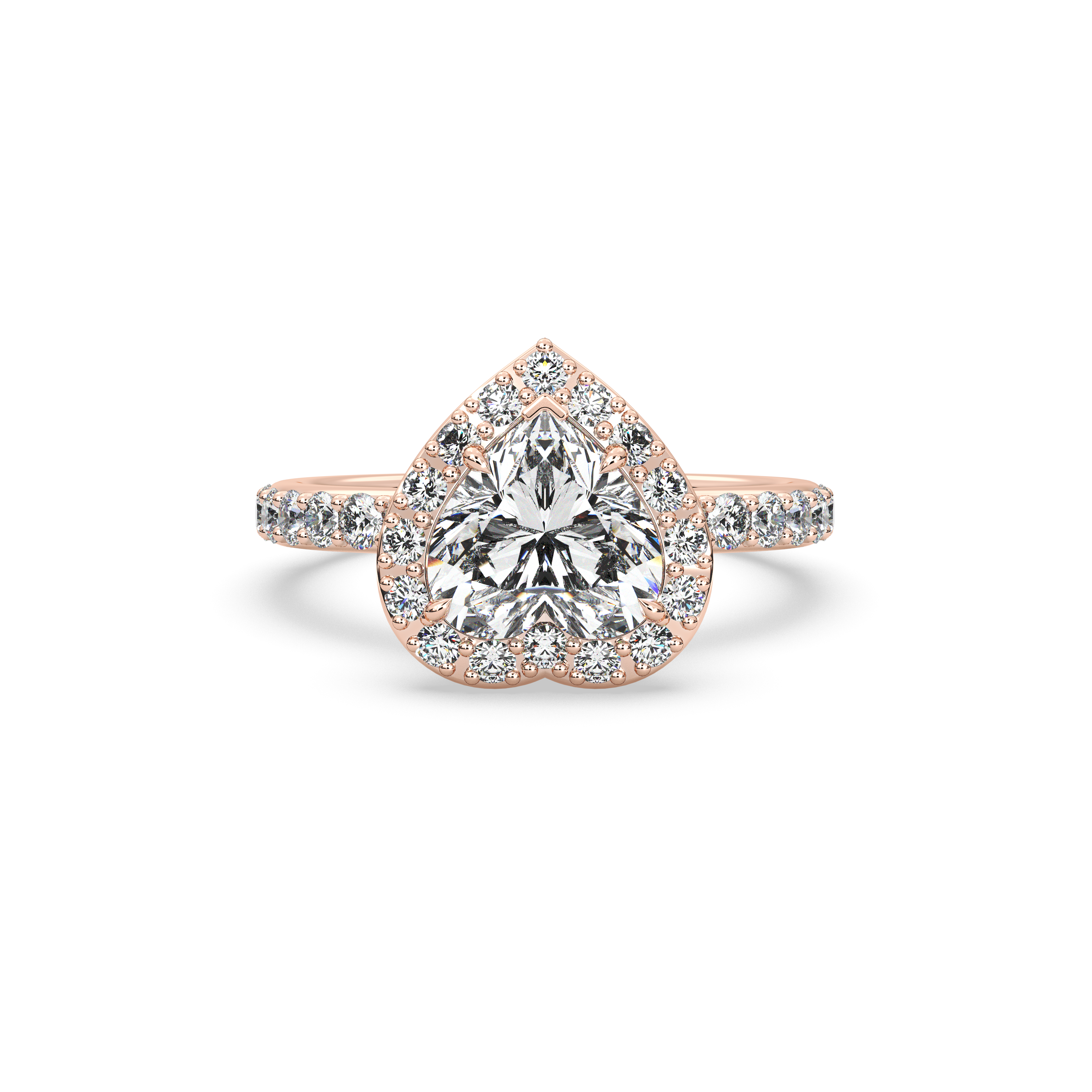 Refined and symbolic, this design features a pear-shaped center diamond framed by a precise halo of 20 round diamonds. The band is lined with 16 accent stones, creating a seamless transition to the center. Beneath the setting, two sculpted hearts cradle the diamond from below—a hidden expression of sentiment. With 37 diamonds in total, this piece balances quiet detail with timeless form.