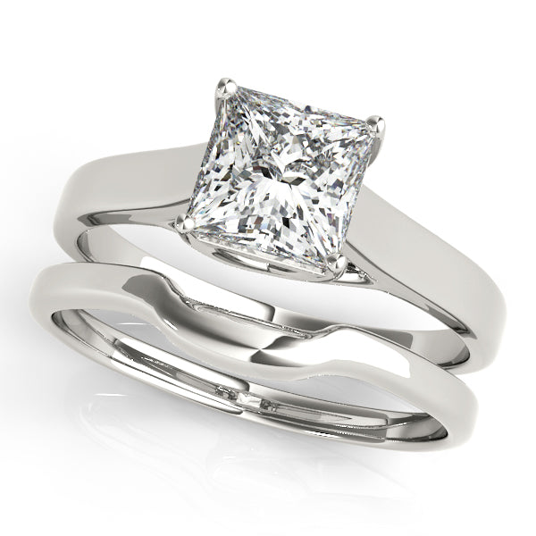 The ring features a sleek and modern design, showcasing a single, prominent diamond at its center. The diamond is cut in a square shape, likely a princess cut, which is known for its sharp, clean lines and brilliant sparkle. It is securely held in place by four prongs, allowing maximum light to enter and enhance its brilliance. The band of the ring is smooth and polished, crafted from a shiny metal, possibly white gold or platinum, which complements the diamond's clarity and brightness. This elegant and timeless piece is perfect for those who appreciate simplicity with a touch of sophistication.