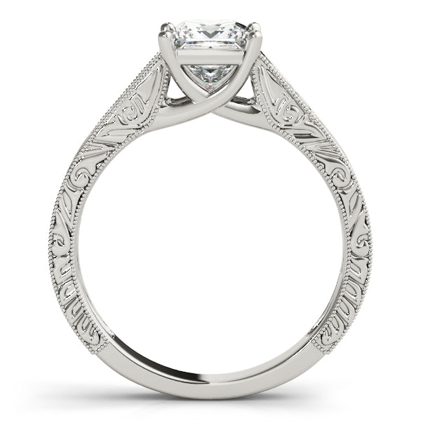 The ring features a stunning and prominent square-cut diamond set in a classic four-prong setting, which beautifully showcases its brilliance and clarity. The band is crafted from polished yellow gold and is adorned with intricate, engraved scrollwork patterns that add a touch of vintage elegance to the design. The combination of the large central diamond and the detailed craftsmanship of the band creates a harmonious blend of modern sophistication and timeless charm, making this ring a captivating piece of jewelry.