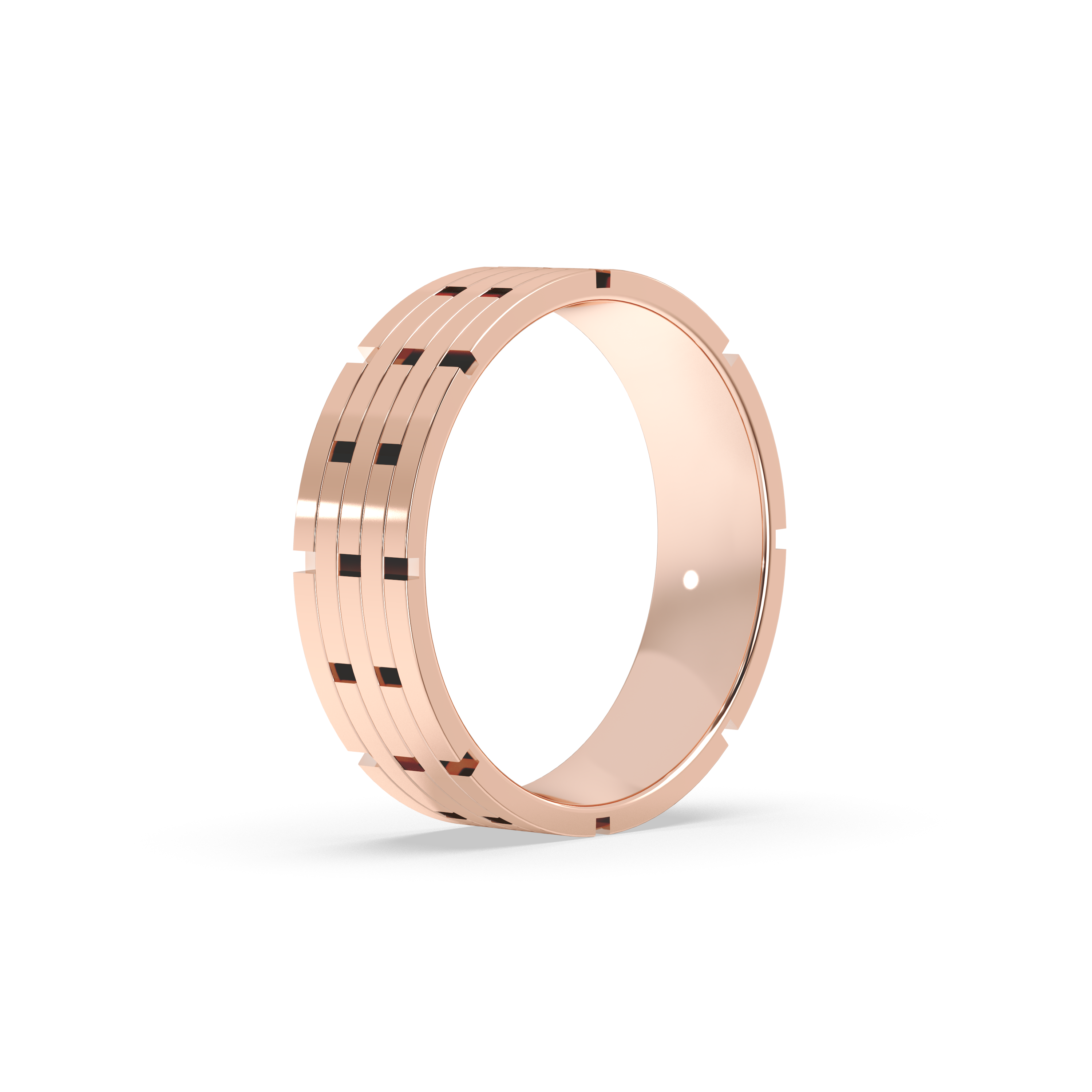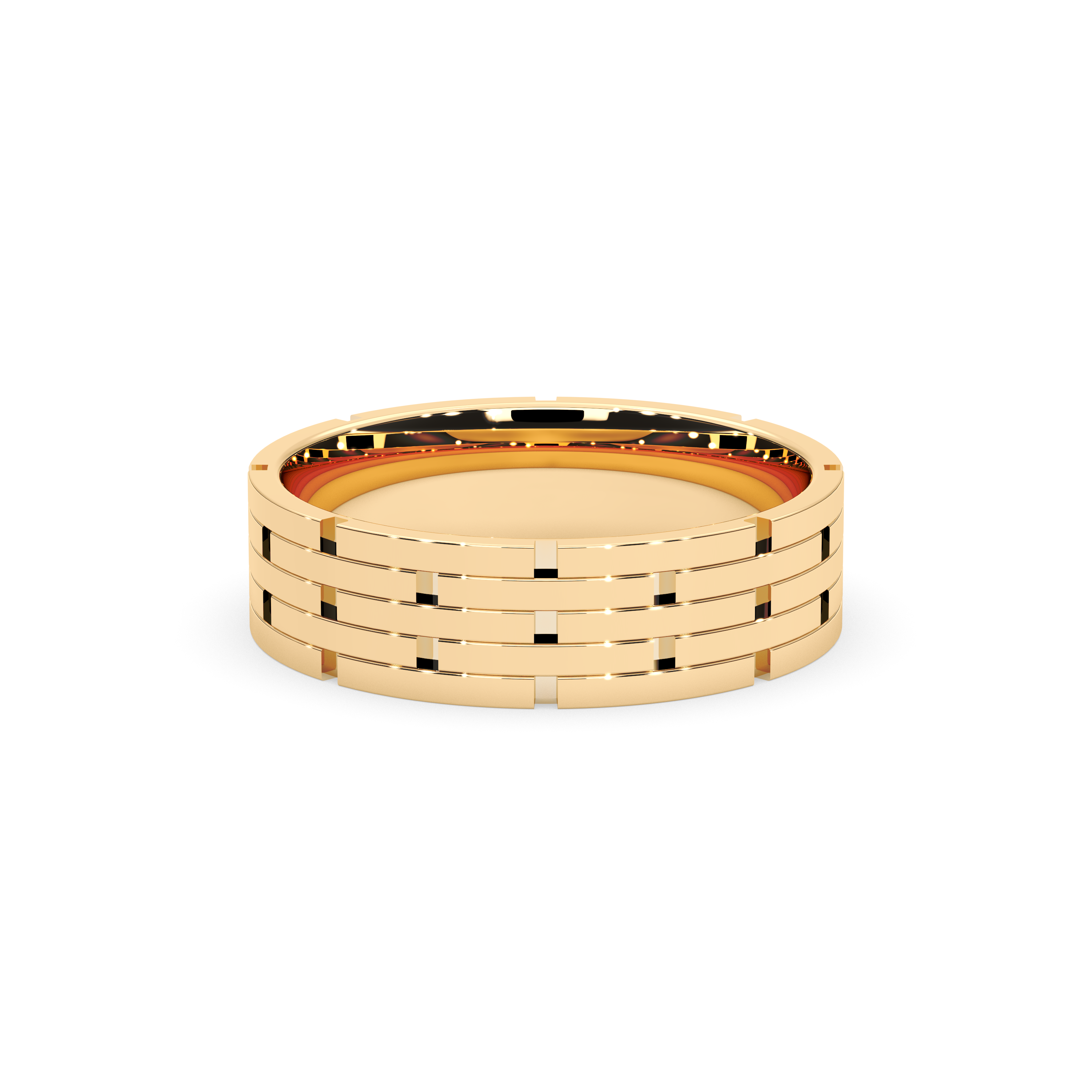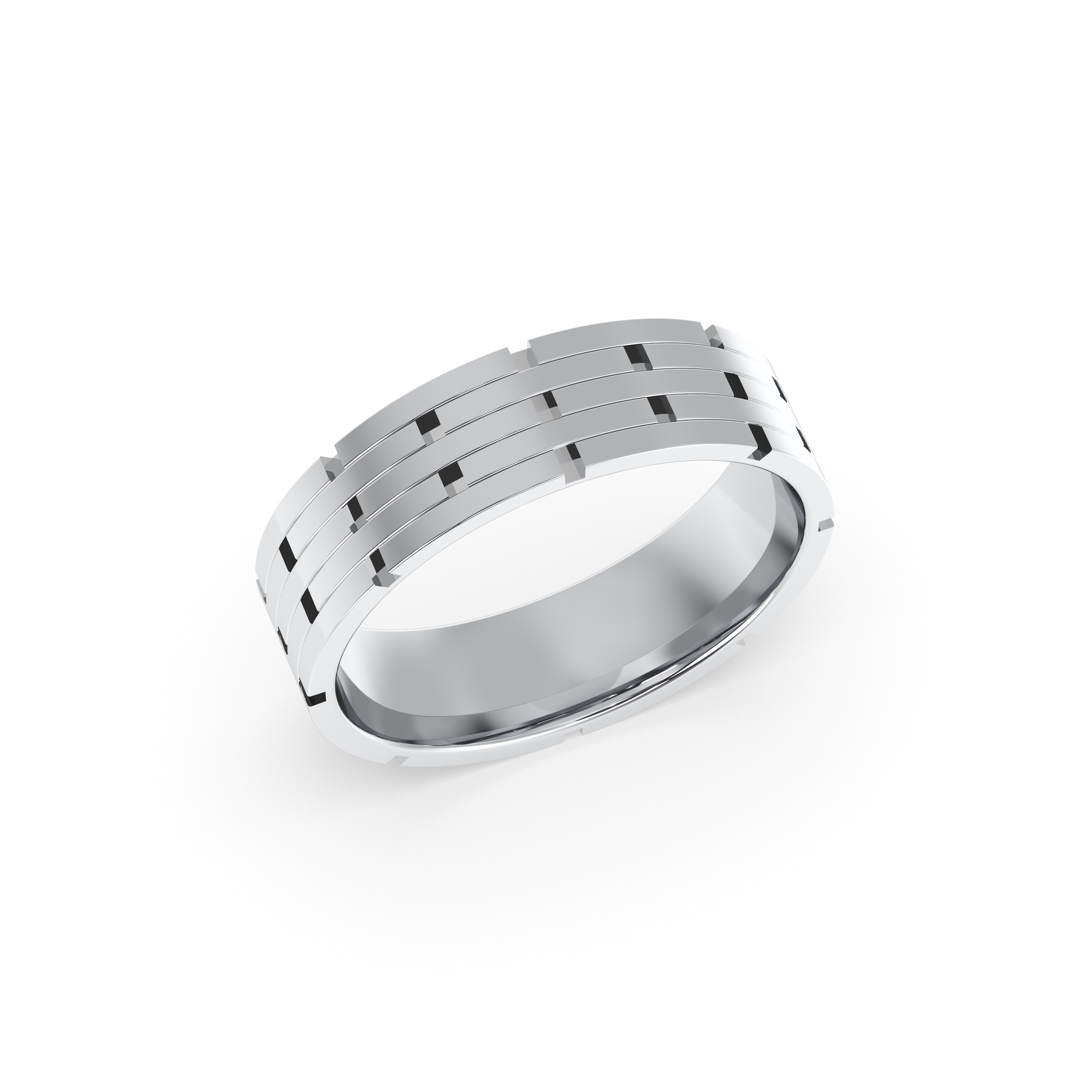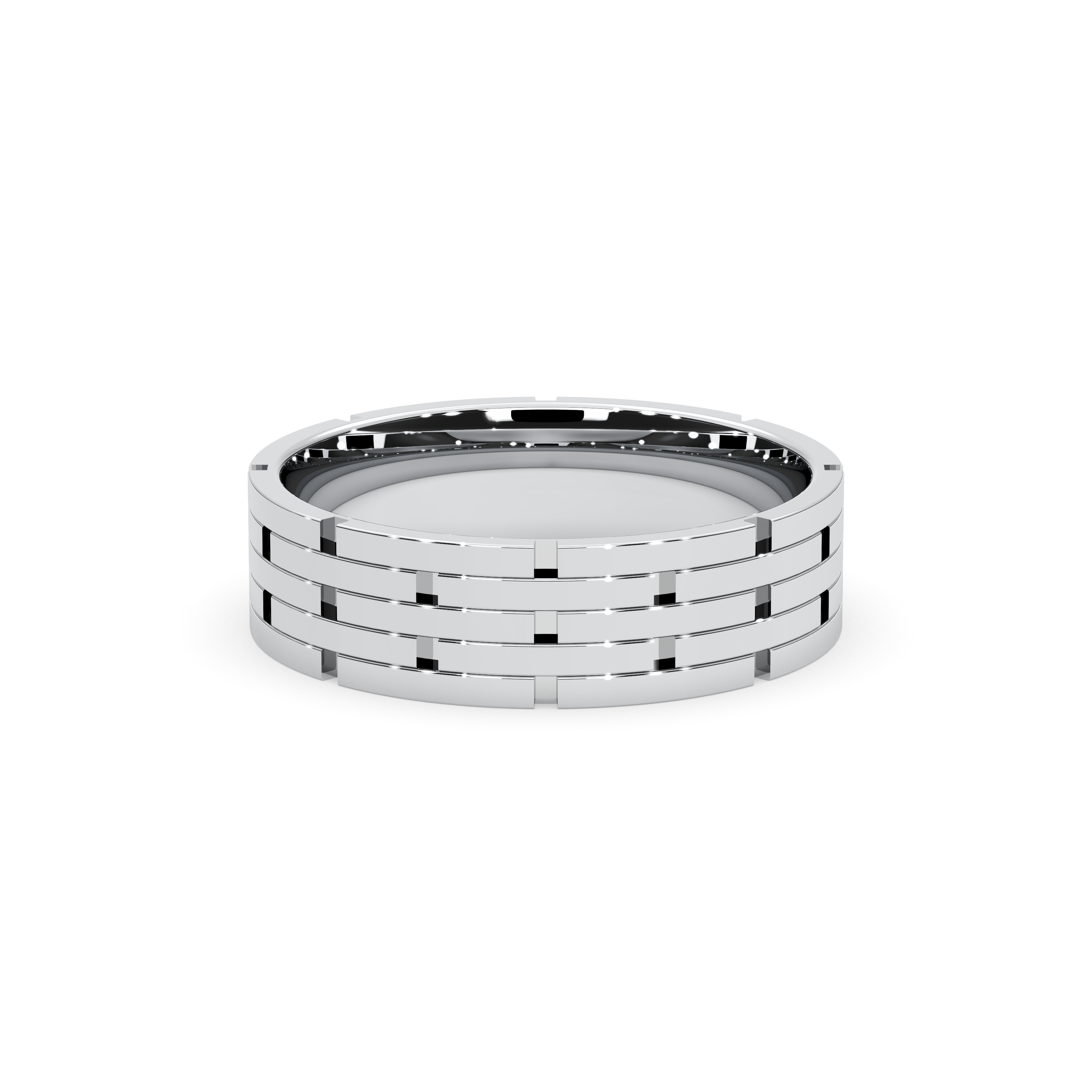 This bold and distinctive men’s wedding band features an intricate, multi-row design inspired by classic link patterns. The polished, architectural structure adds a sense of depth and strength, making it an ideal choice for those who appreciate craftsmanship and a statement look. Timeless yet contemporary, this ring embodies both sophistication and individuality.