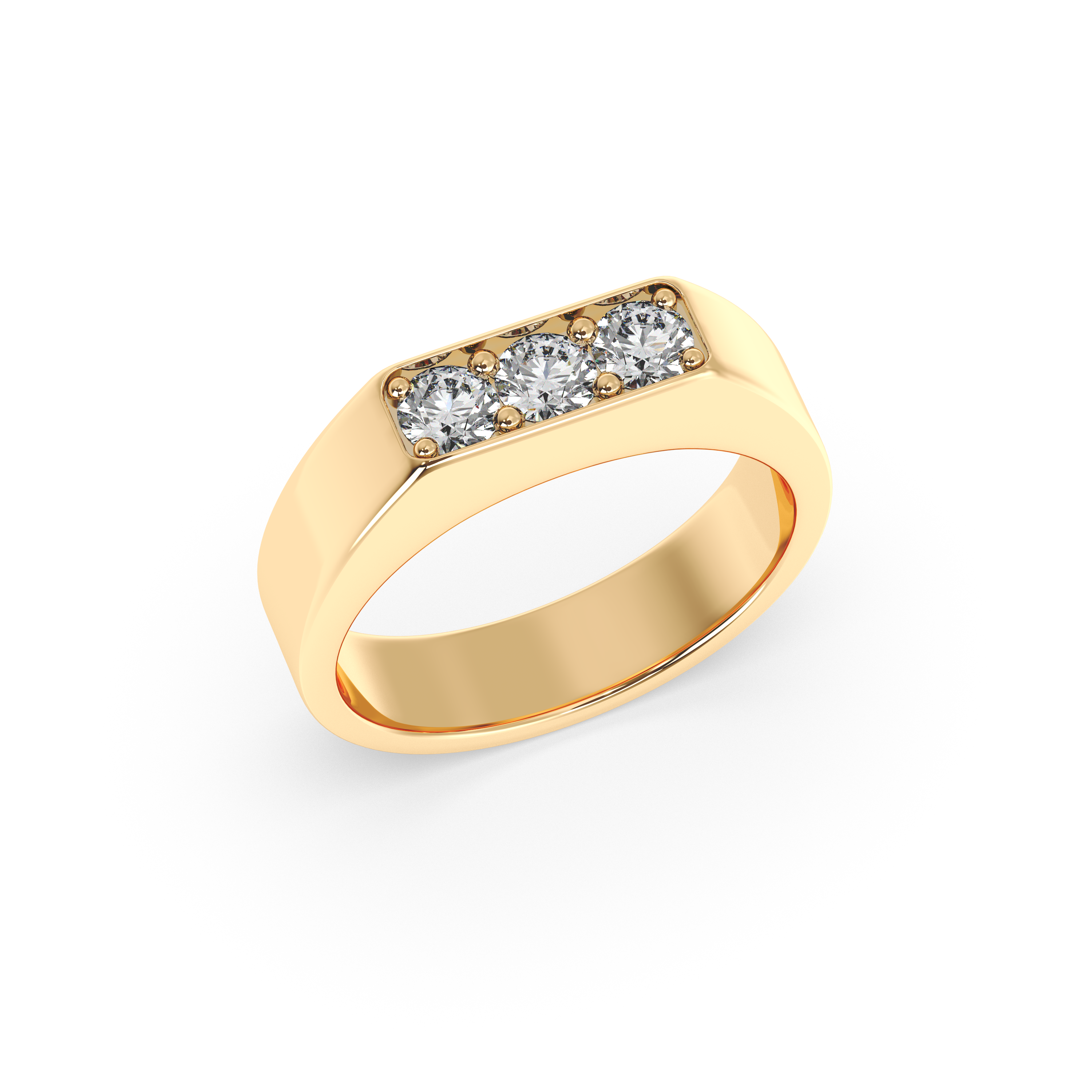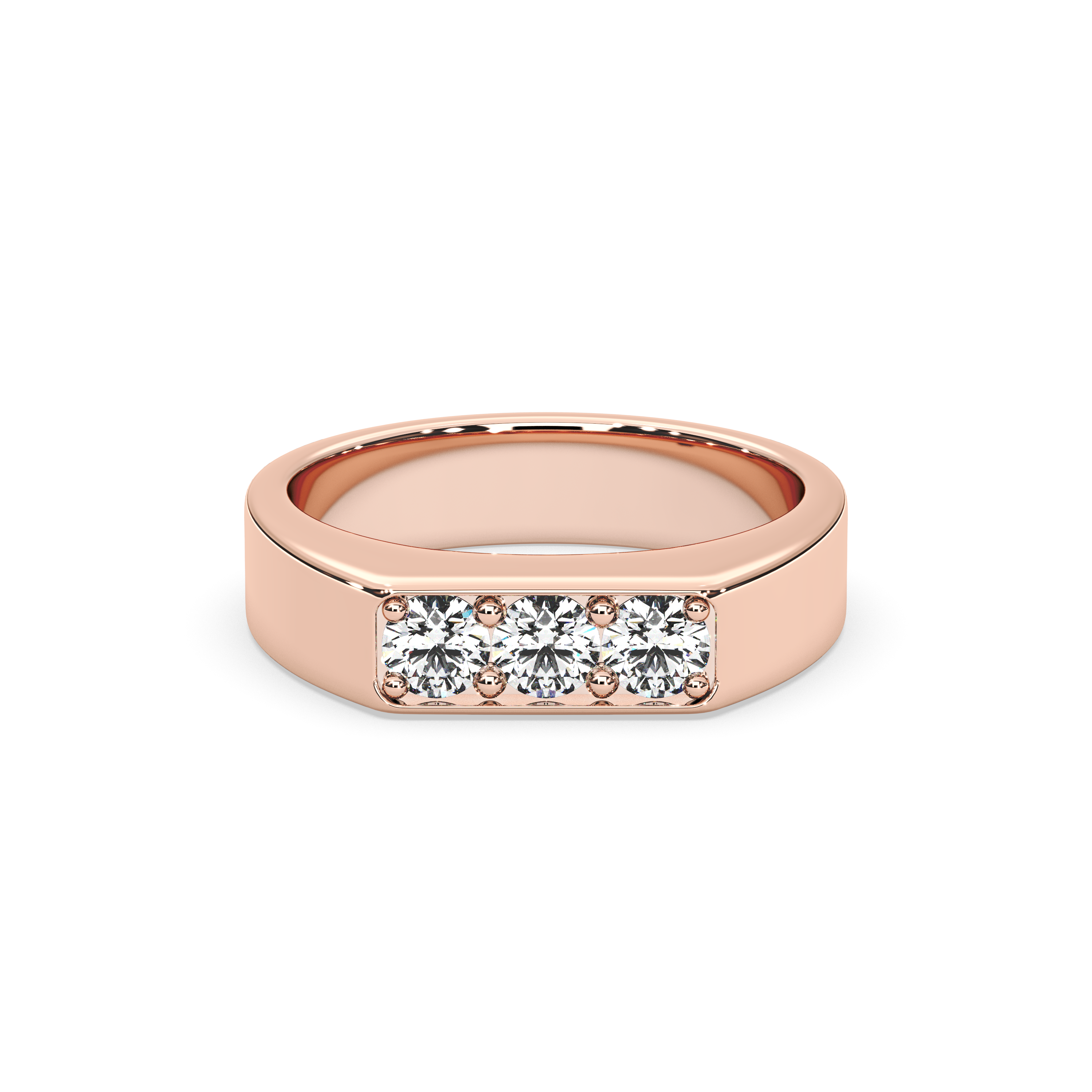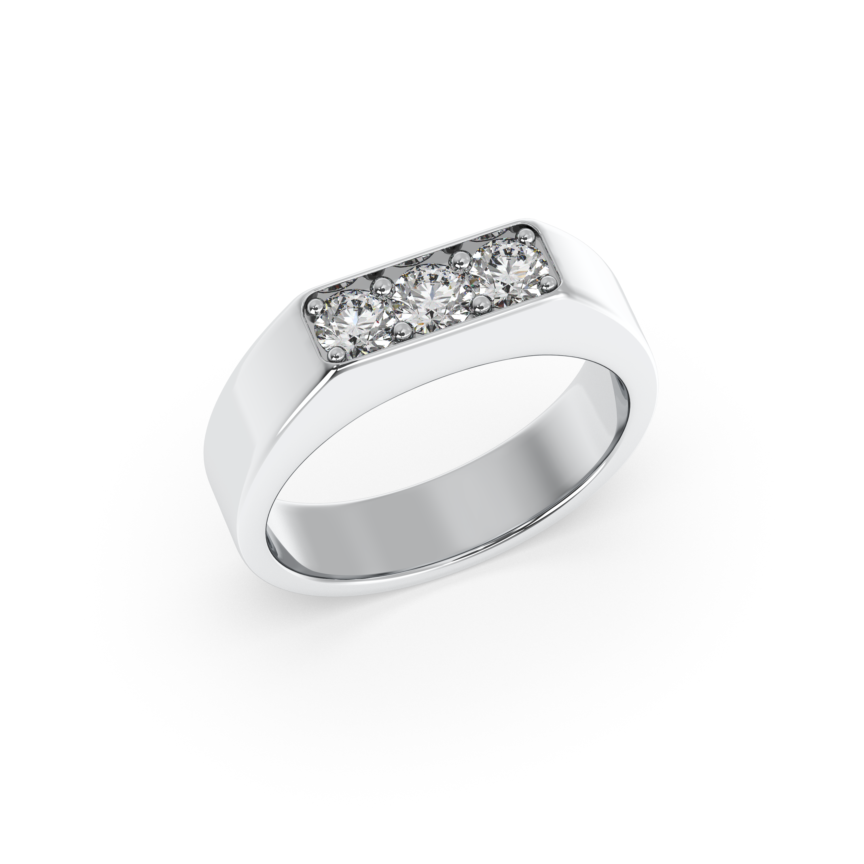 This bold and modern men’s band is distinguished by its sleek, substantial profile and a striking trio of round brilliant diamonds set flush across the top. The clean lines and strong presence offer a contemporary twist on classic elegance, making this ring a sophisticated choice for those who appreciate refined simplicity with a touch of brilliance. Perfect as a wedding band or an everyday statement, it balances luxury and understatement in perfect harmony.