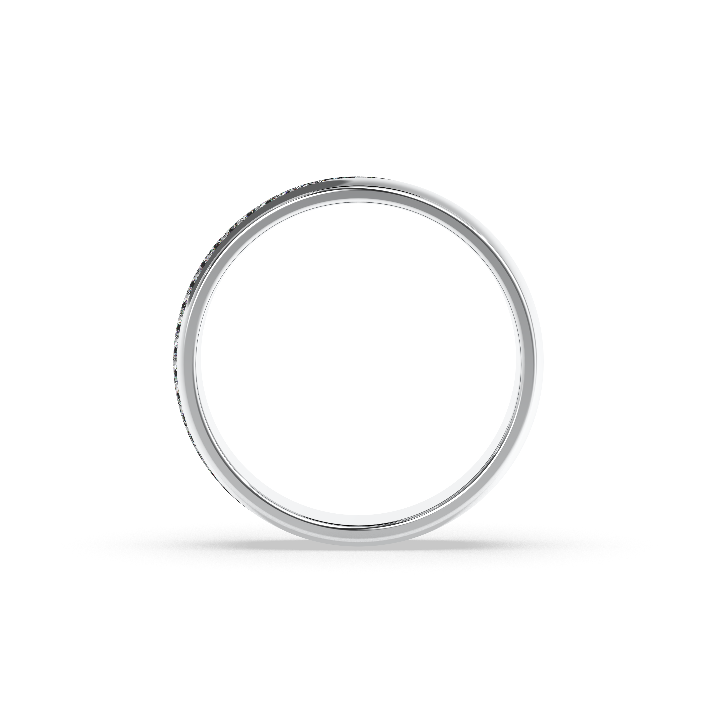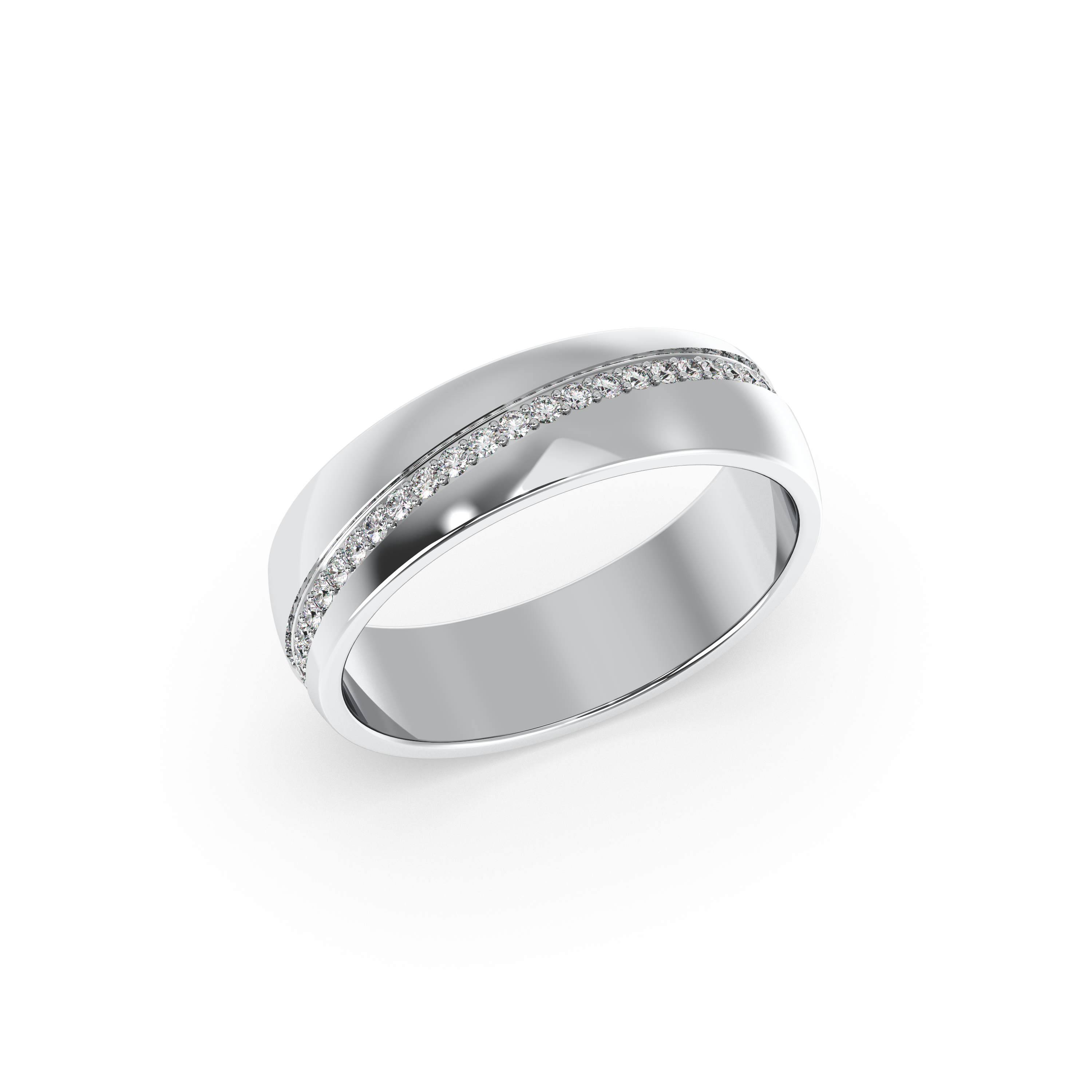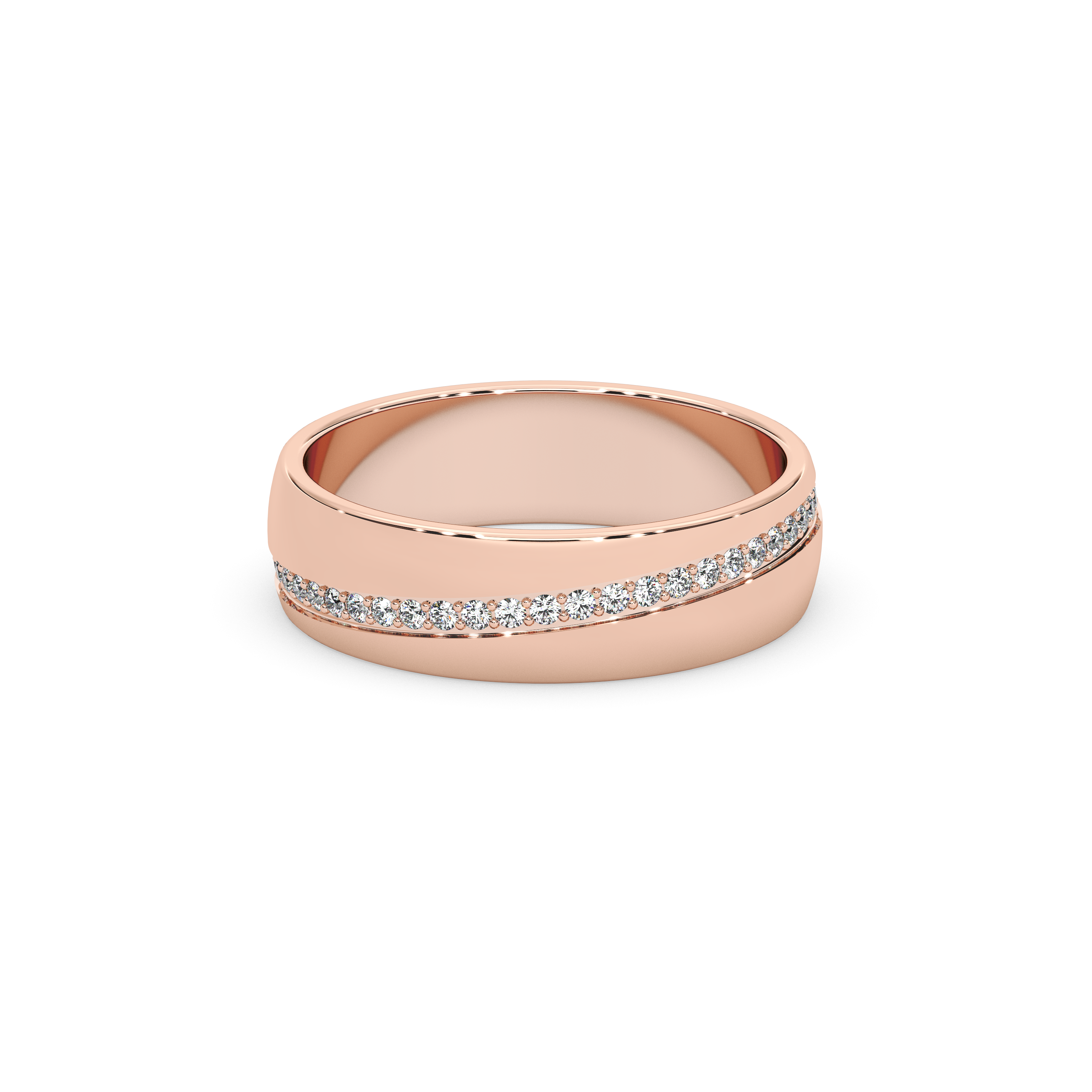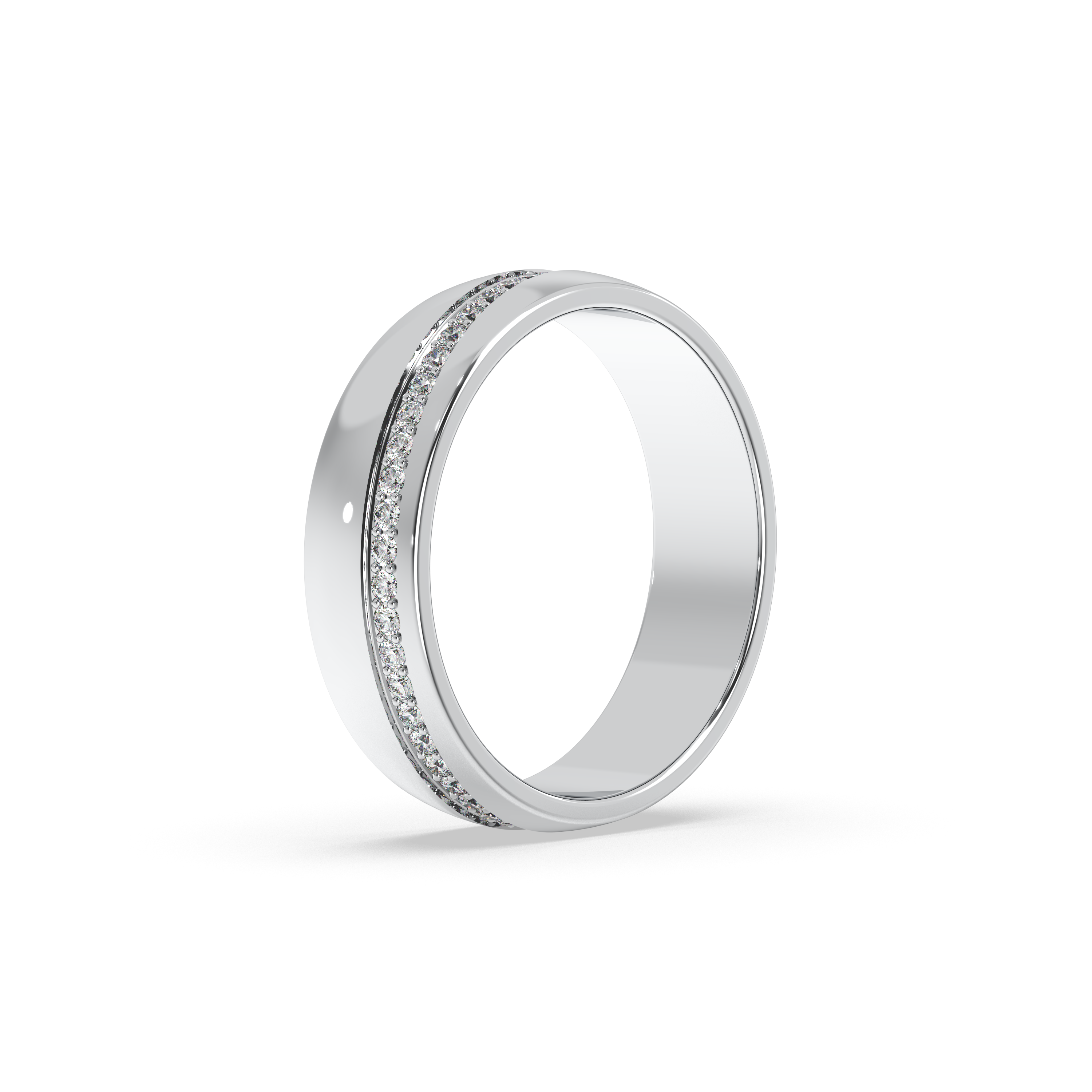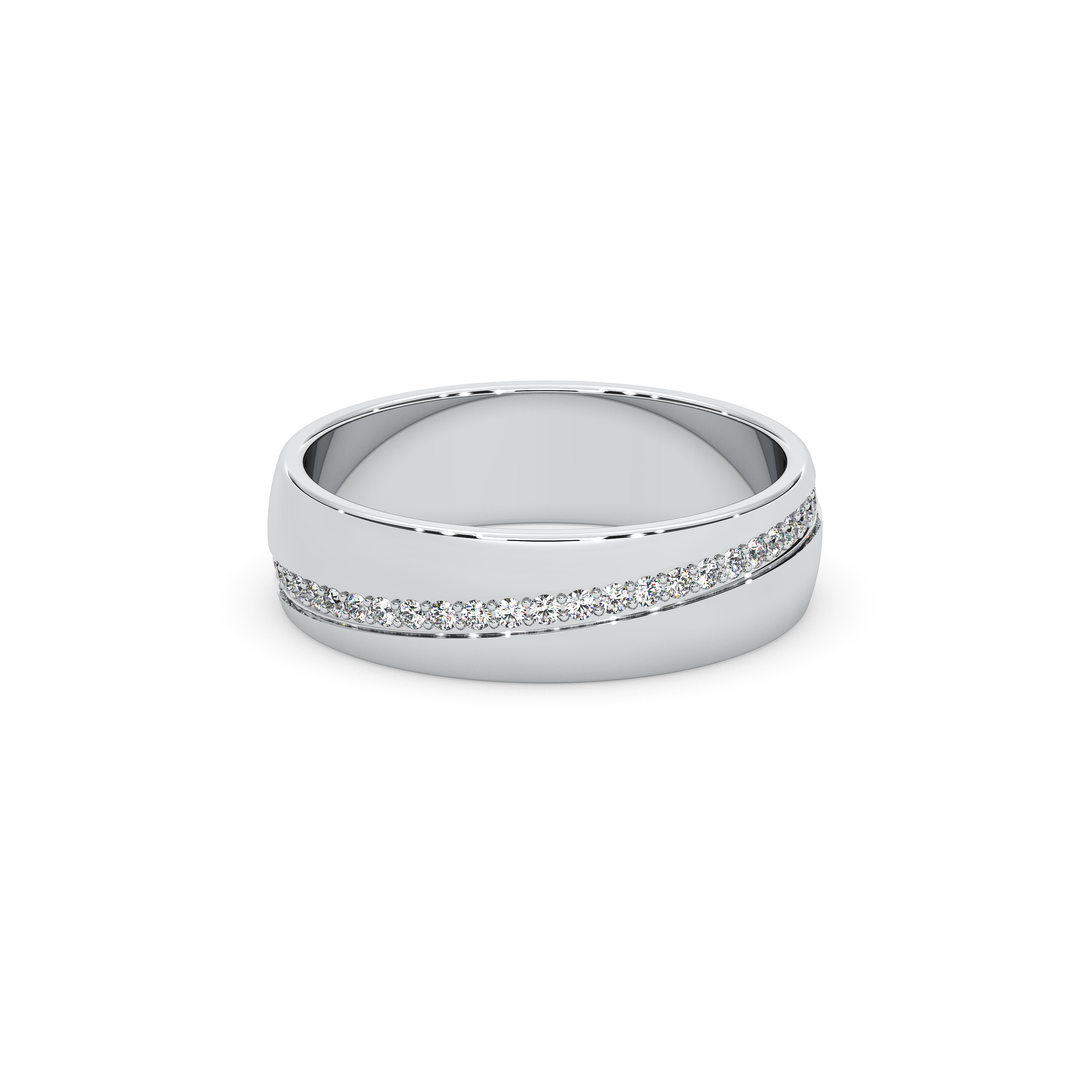 This contemporary men’s band features a distinctive diagonal channel set with a row of round brilliant diamonds, gracefully sweeping across the polished surface. The gentle curve of the diamond line adds dynamic movement and visual interest, while the wide, smooth band provides a bold yet sophisticated presence. A modern classic, this ring is perfect for those who appreciate a unique twist on timeless style.