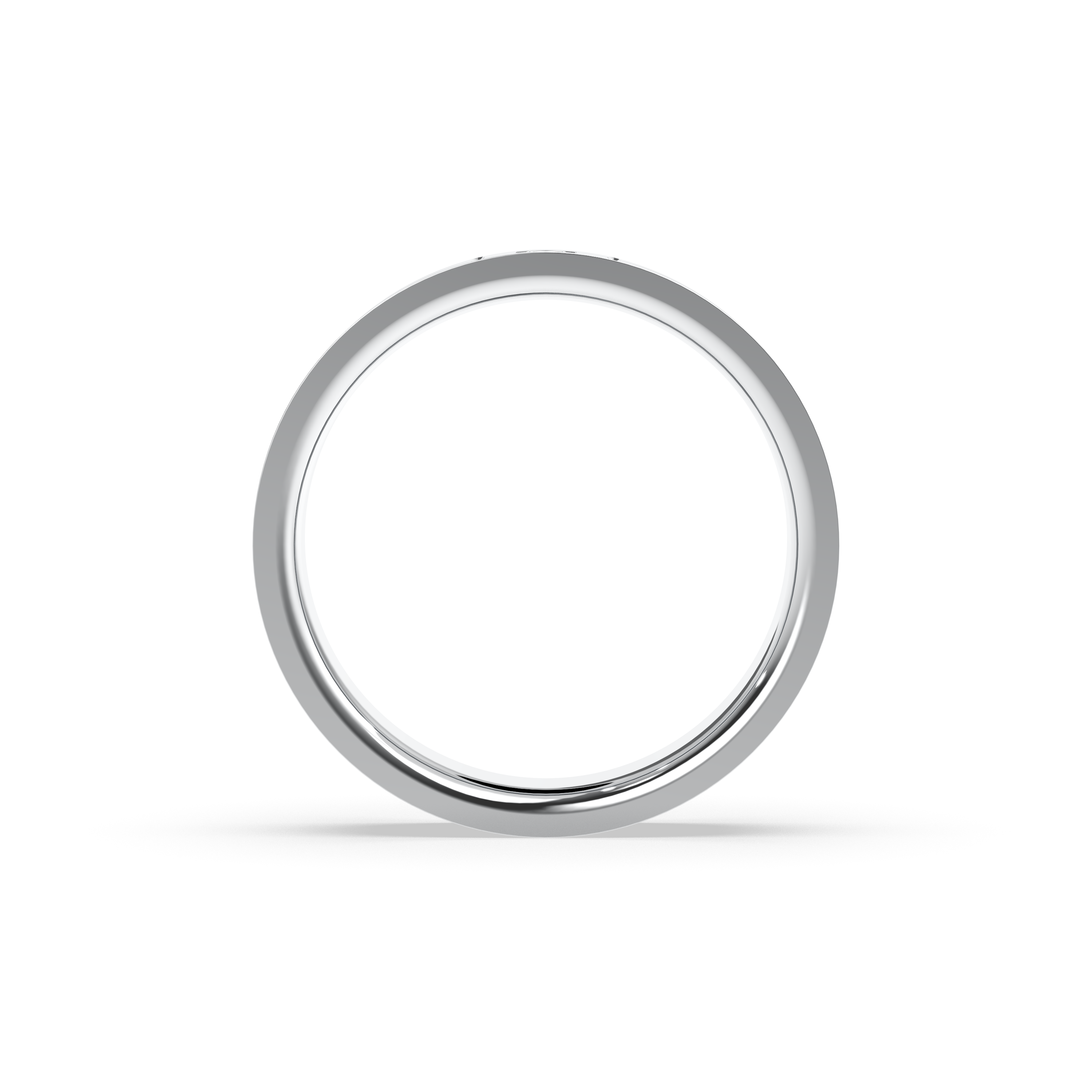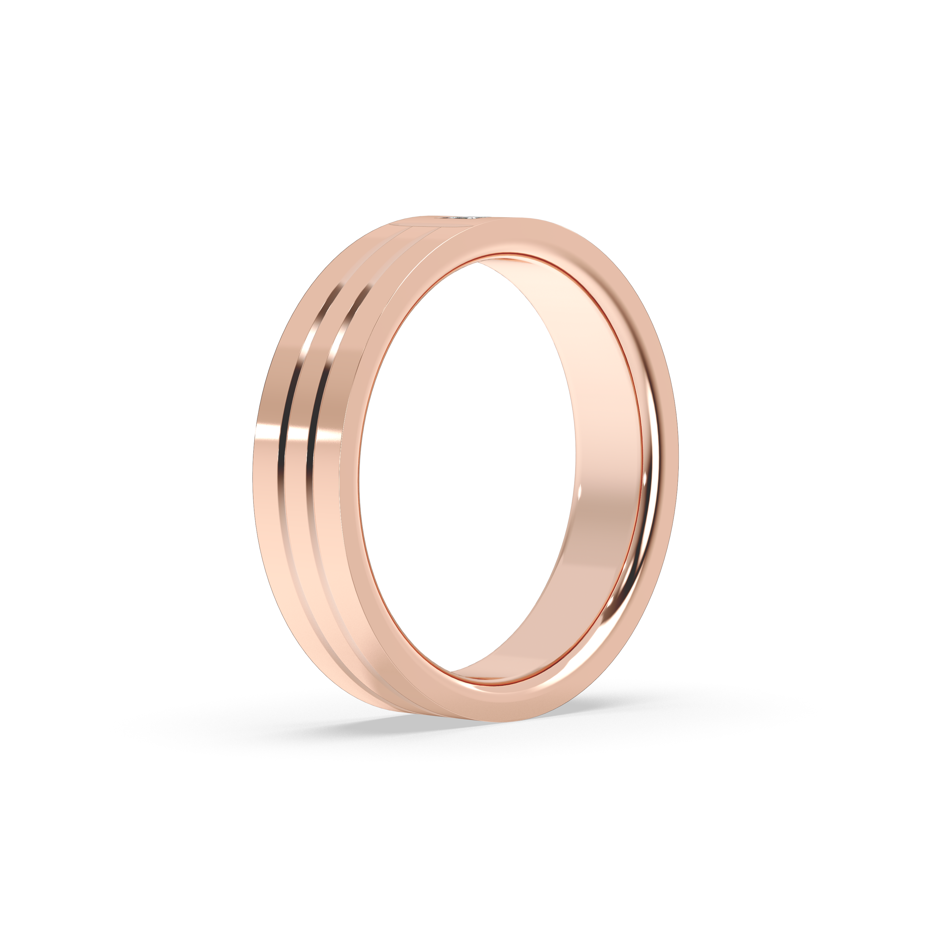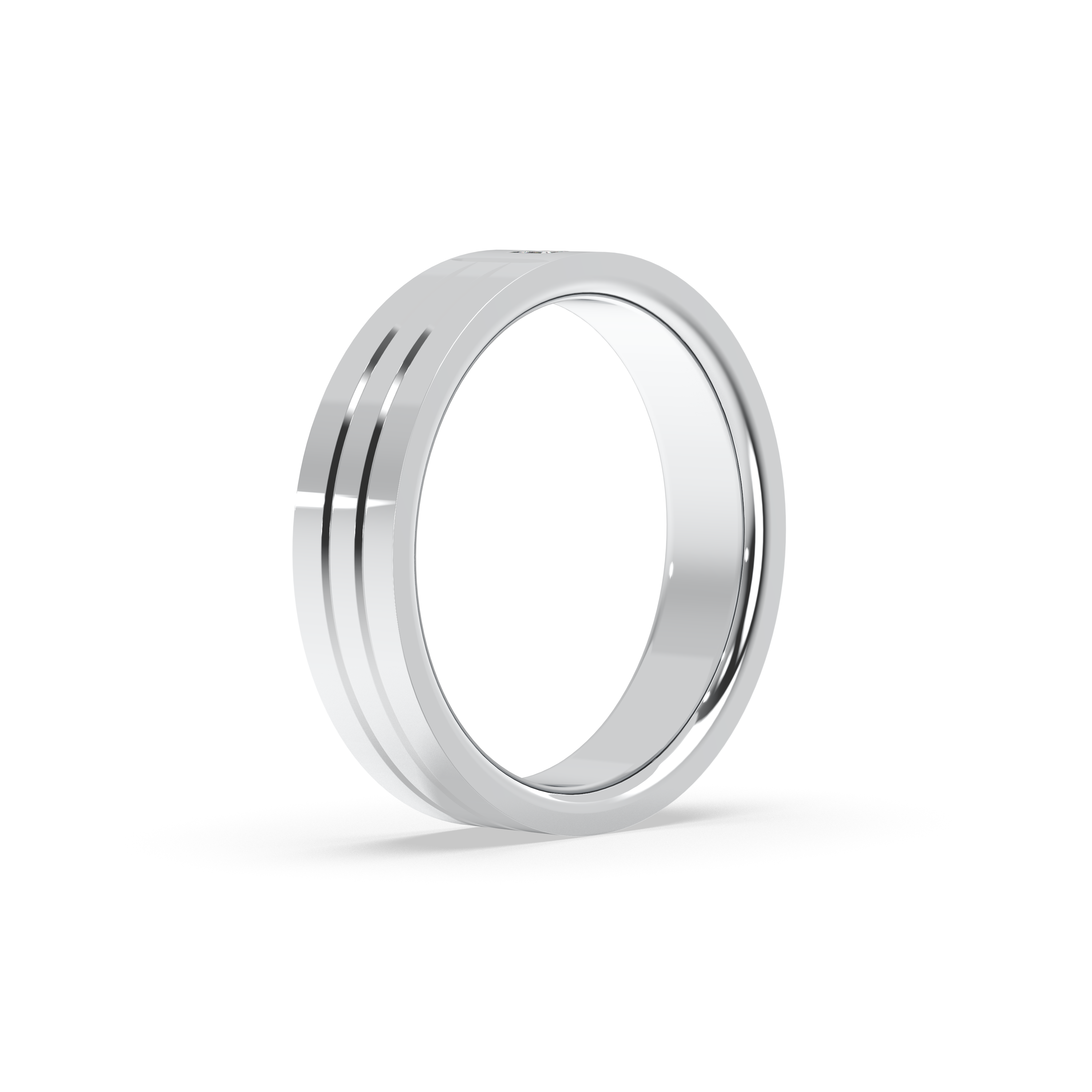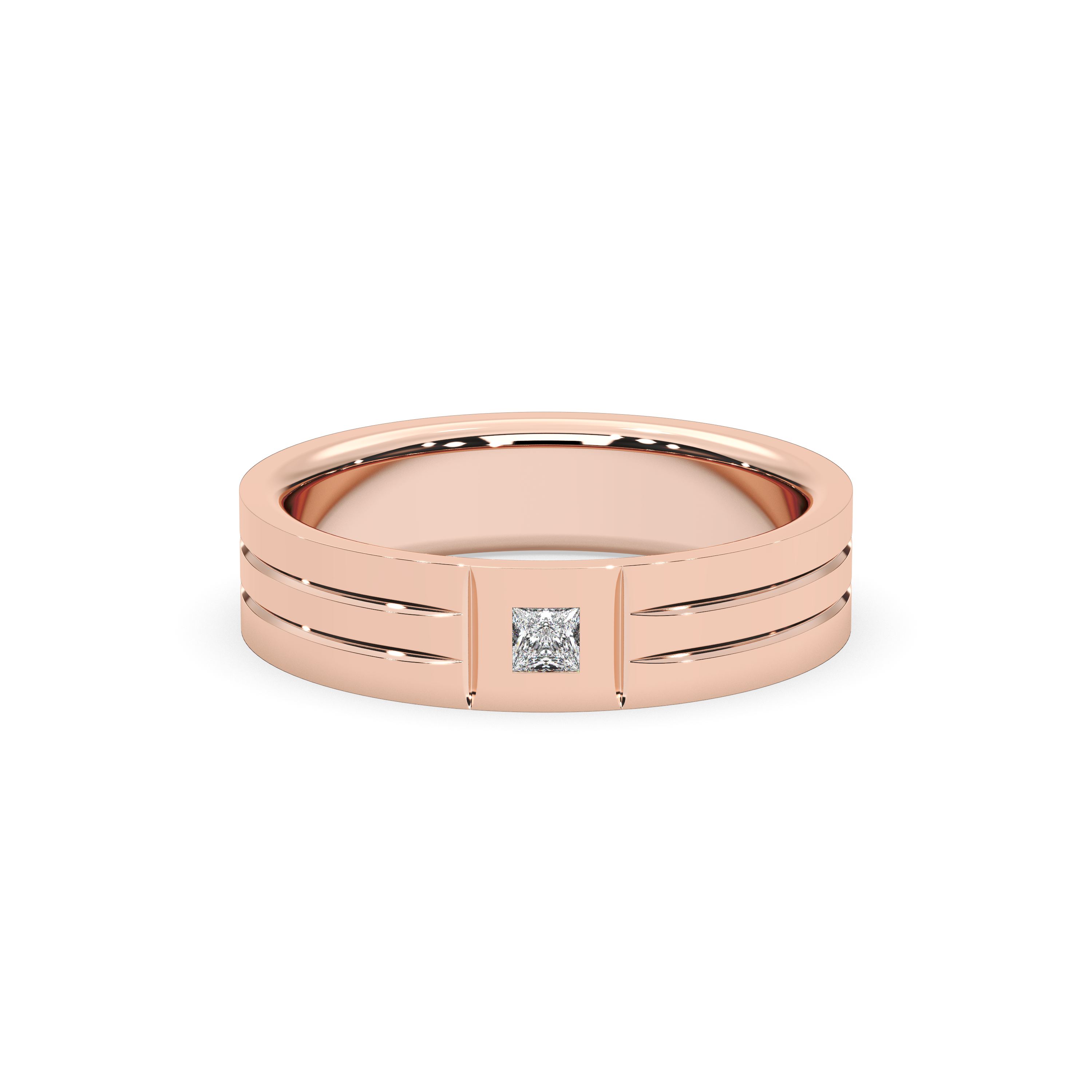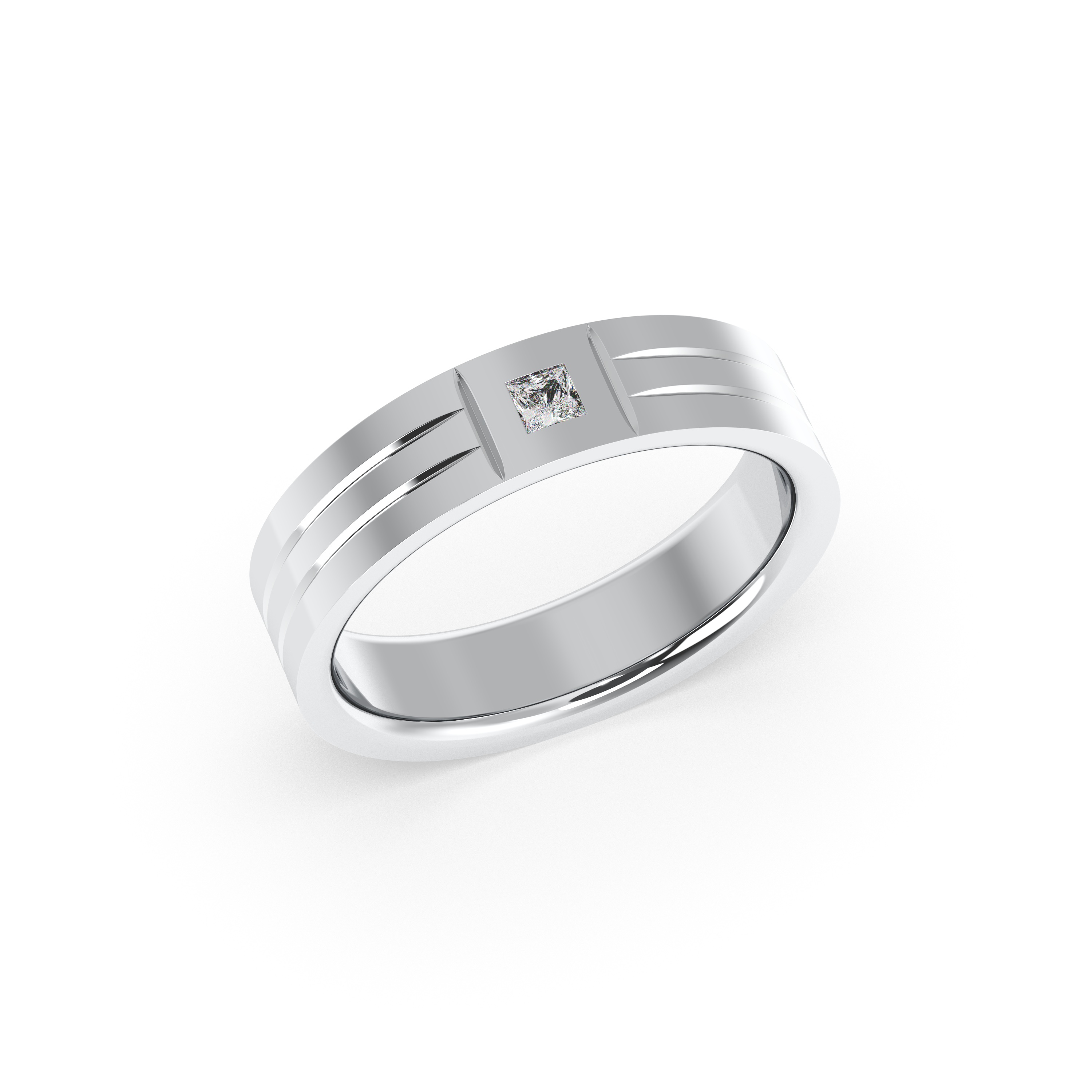 This sophisticated men’s band features a modern profile with bold engraved detailing along the edges, highlighting a single princess-cut diamond set at the center. The clean lines and architectural feel lend a contemporary edge, while the square diamond adds a subtle touch of luxury. Perfect for those who value understated elegance with a distinctive, modern twist.