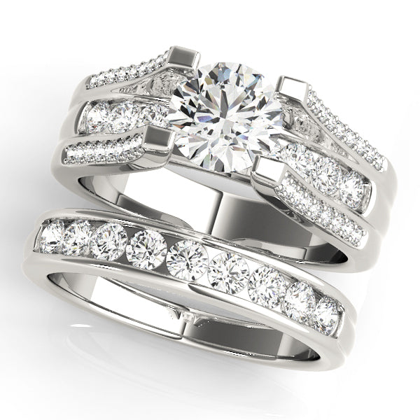 This elegant ring features a classic three-stone design, showcasing a stunning arrangement of diamonds. At the center, a larger round brilliant-cut diamond is flanked by two slightly smaller round diamonds, creating a harmonious and balanced appearance. Each diamond is securely held in place by...