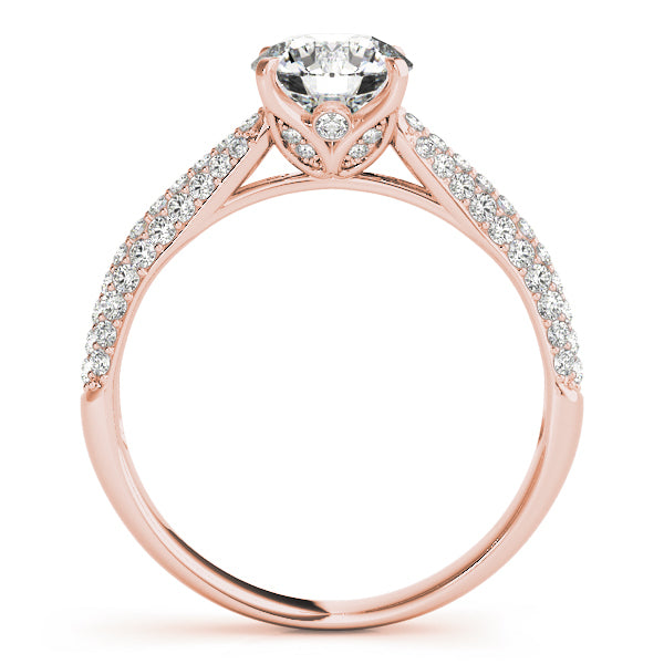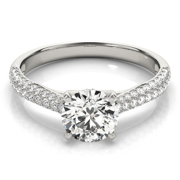 This exquisite ring features a stunning design that combines elegance and brilliance. At its center, a large, round-cut diamond is securely set in a classic four-prong setting, capturing attention with its dazzling sparkle. The band is crafted from polished yellow gold, adding a touch of warmth and luxury to the piece. Adorning the band are two rows of smaller, meticulously set diamonds that extend halfway around, enhancing the ring's overall radiance and sophistication. This ring is a perfect blend of timeless beauty and modern elegance, making it an ideal choice for special occasions or as a symbol of everlasting love.