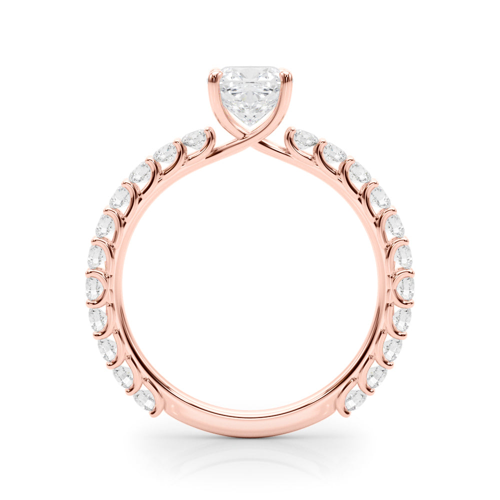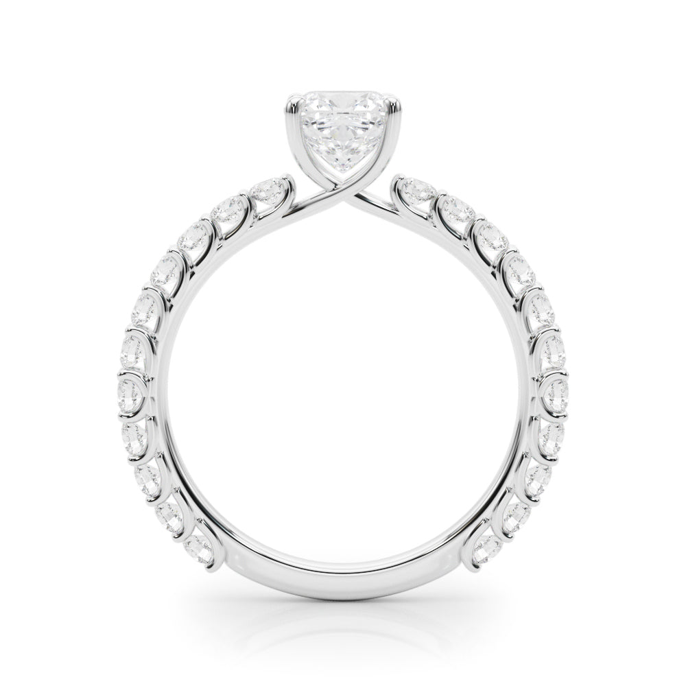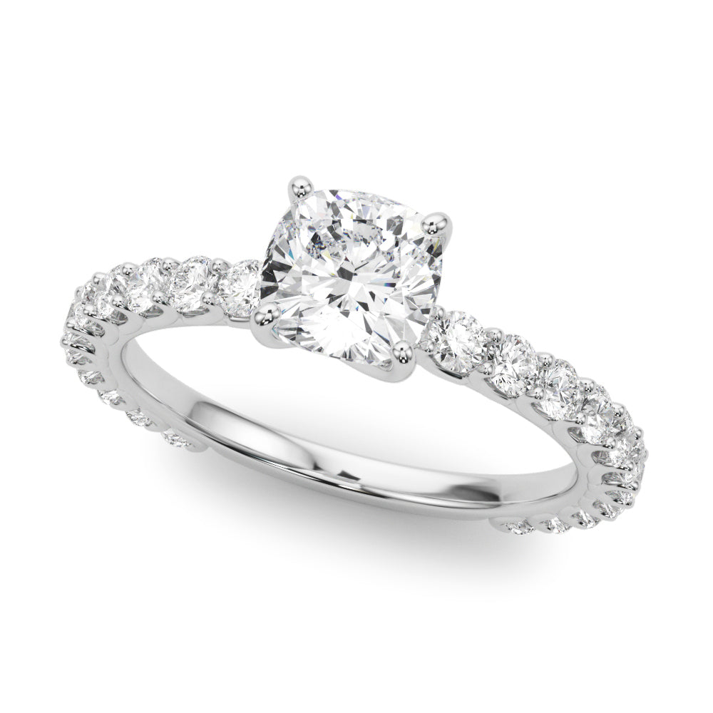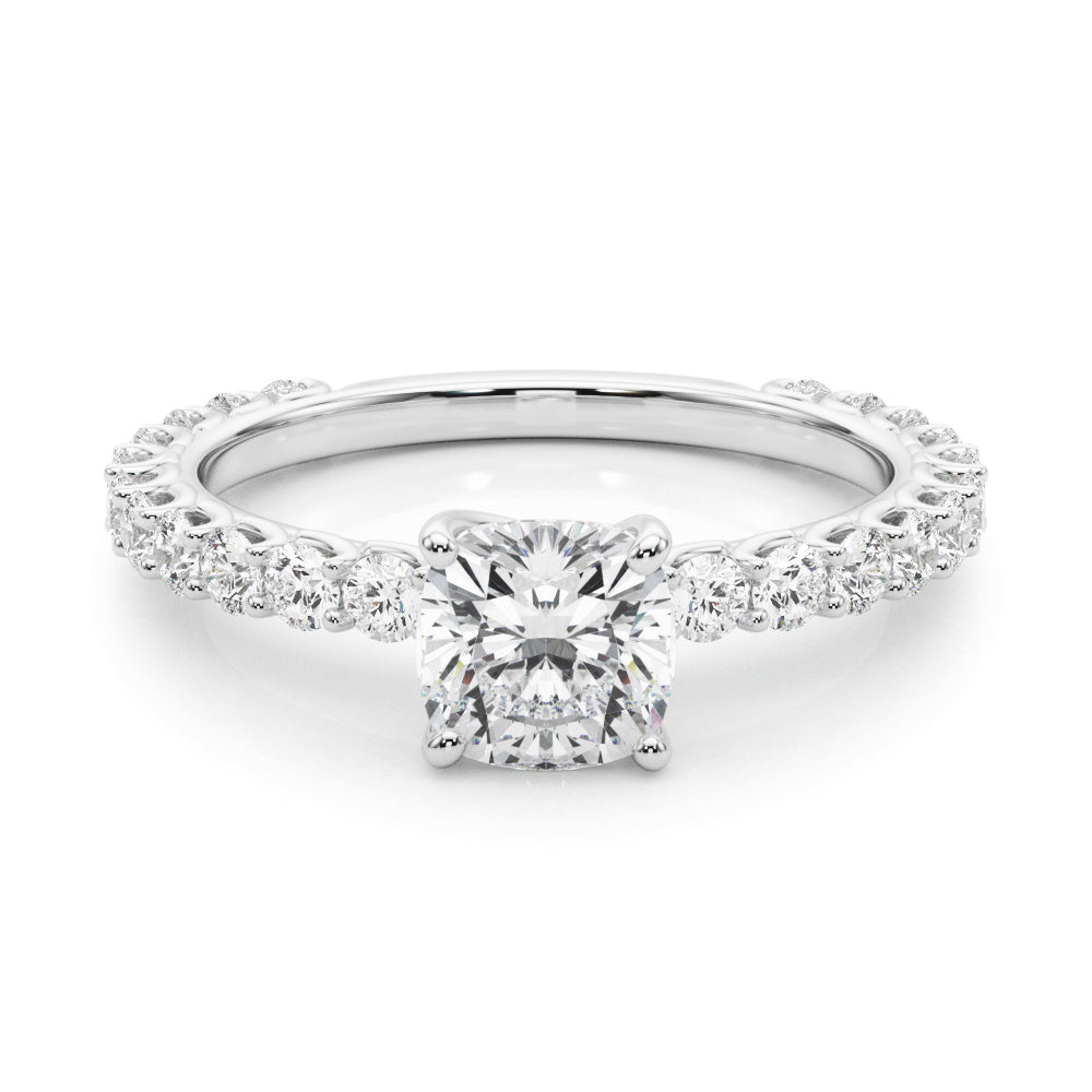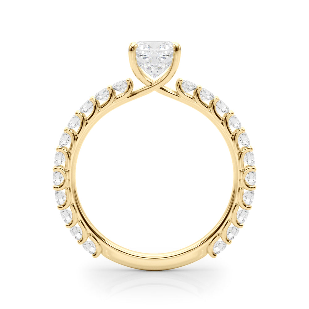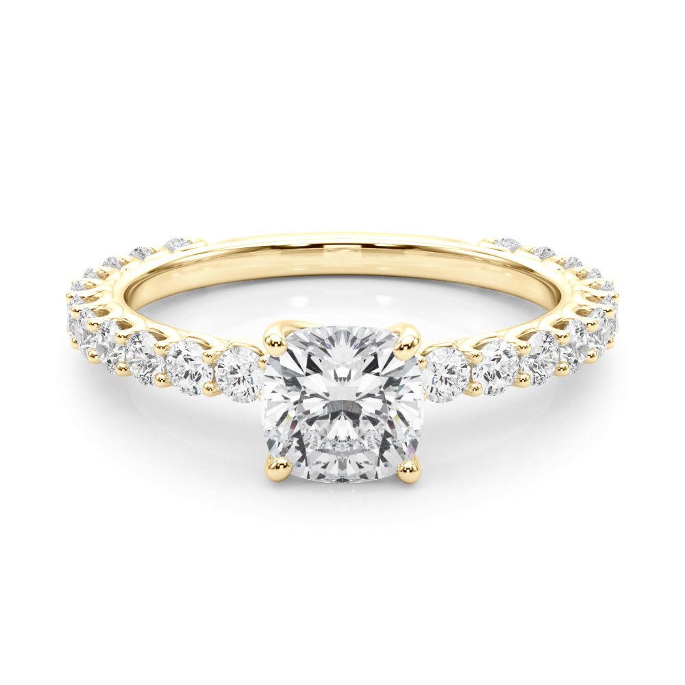 This exquisite ring features a stunning cushion-cut diamond as its centerpiece, held securely by four elegant prongs. The band is crafted from polished yellow gold, adding a classic and luxurious touch to the overall design. Along the band, a series of smaller round diamonds are meticulously set, enhancing the ring's brilliance and sparkle. These accent diamonds are arranged in a pavé setting, creating a seamless and continuous line of shimmer that complements the central stone beautifully. The combination of the bold central diamond and the delicate, sparkling band makes this ring a perfect blend of elegance and sophistication, ideal for special occasions or as a timeless engagement ring.