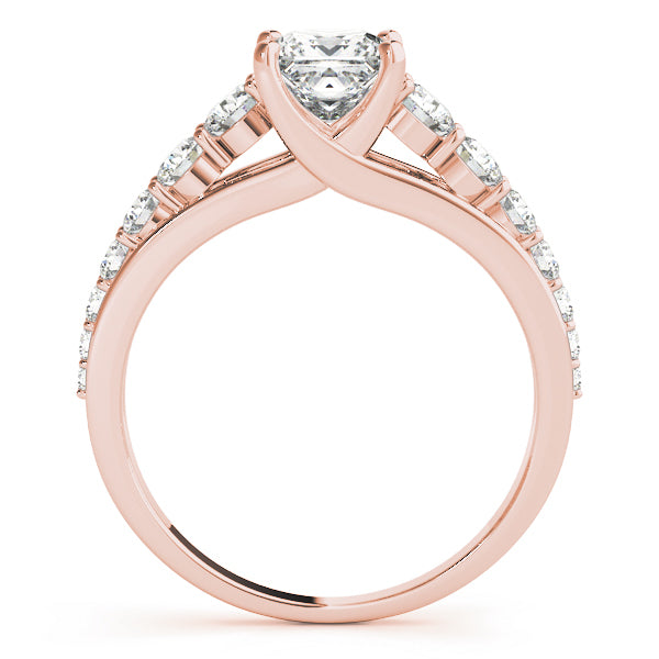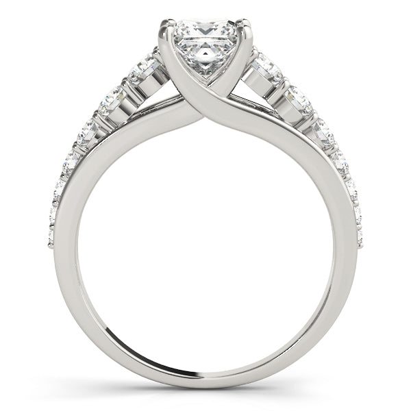 This elegant ring features a stunning design crafted in yellow gold. At its center, a prominent princess-cut diamond is securely held in place by four prongs, serving as the focal point of the piece. Flanking the central diamond are eight smaller round-cut diamonds, four on each side, which add a touch of brilliance and enhance the overall sparkle of the ring. The band itself is sleek and polished, complementing the dazzling array of diamonds. This ring exudes a timeless charm, making it a perfect choice for an engagement or a special occasion.