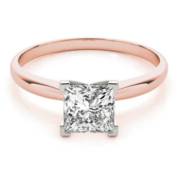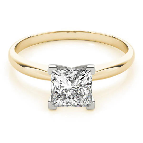 The ring features a sleek and elegant design, crafted from polished yellow gold. At its center, it showcases a stunning square-cut diamond, securely held in place by four prongs at each corner. The diamond is the focal point of the ring, exuding brilliance and sophistication. The band is smooth and slightly tapered, complementing the diamond's sparkle without overpowering it. This classic yet contemporary piece is perfect for those who appreciate understated elegance and timeless beauty.