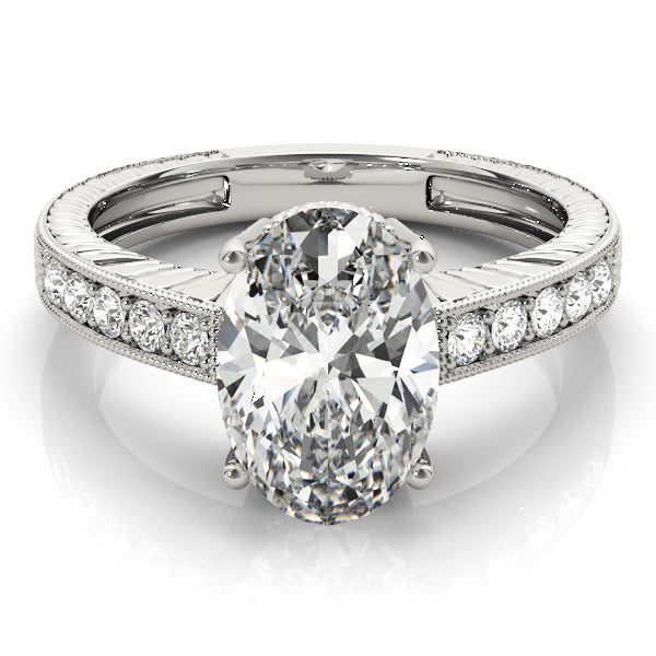 This exquisite ring features a stunning oval-shaped central diamond, which is the focal point of the piece. The central diamond is elegantly set in a four-prong setting, allowing maximum light to enhance its brilliance. The band is crafted from polished yellow gold, adding a touch of warmth and classic elegance to the design. Along the band, there are six smaller round diamonds on each side of the central stone, totaling twelve, which are set in a channel setting. These smaller diamonds add extra sparkle and complement the central diamond beautifully, creating a harmonious and luxurious appearance. The combination of the large central diamond with the smaller accent diamonds and the rich gold band makes this ring a timeless and sophisticated piece of jewelry.