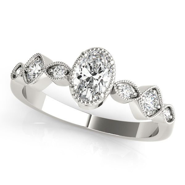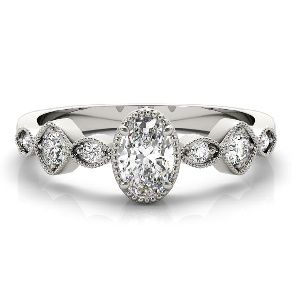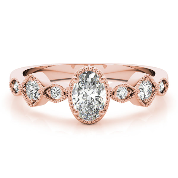 This exquisite ring features a stunning design crafted in yellow gold, showcasing a total of seven sparkling diamonds. At its center is a large, oval-shaped diamond that captures attention with its brilliance and clarity. Flanking the central diamond are six smaller round diamonds, each set in a delicate marquise-shaped bezel that adds an elegant touch to the overall design. The combination of the central oval diamond and the surrounding round diamonds creates a harmonious balance, making this ring a perfect blend of classic elegance and modern sophistication. The intricate detailing and the warm hue of the gold band further enhance the ring's luxurious appeal, making it a timeless piece suitable for any special occasion.