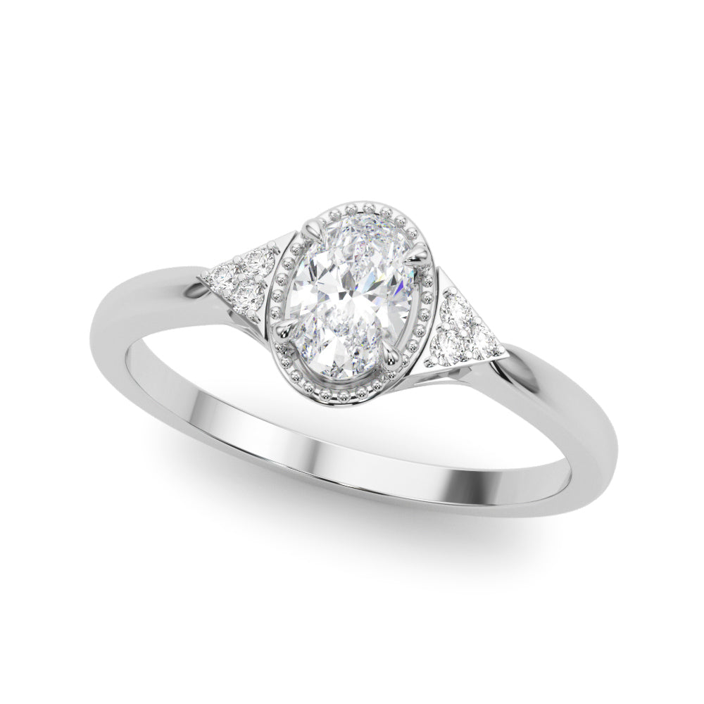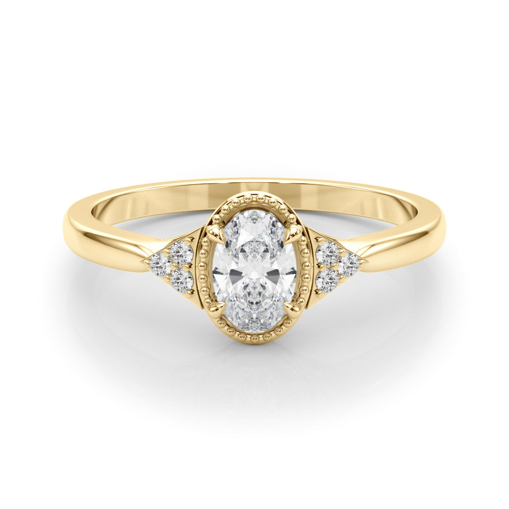 This elegant ring features a stunning design crafted in yellow gold. At its center is a large, oval-shaped diamond that captures attention with its brilliance and clarity. Flanking the central diamond on each side are three smaller round diamonds, arranged in a triangular pattern, adding extra sparkle and sophistication to the piece. The combination of the central diamond's grandeur and the delicate arrangement of the side stones creates a harmonious and luxurious aesthetic. The band is sleek and polished, complementing the overall elegance of the ring, making it a perfect choice for those seeking a timeless and exquisite piece of jewelry.
