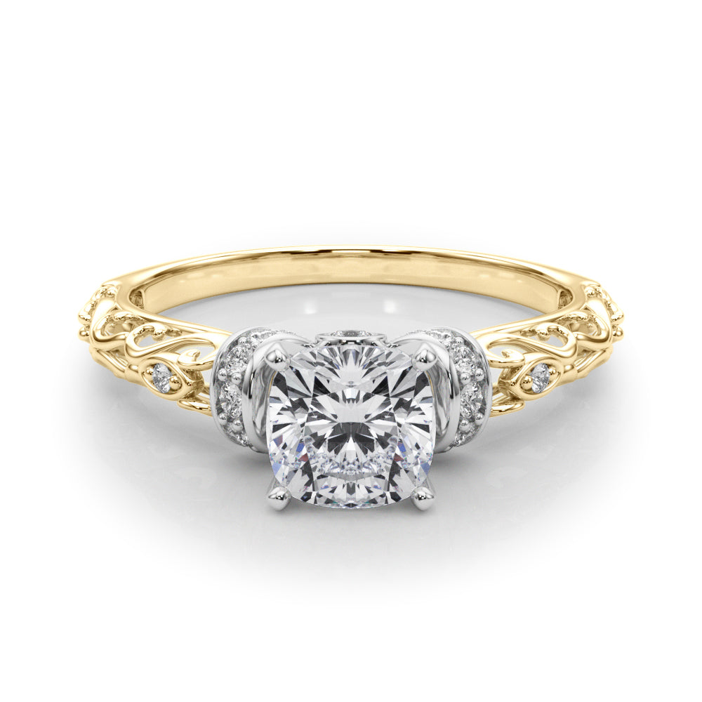 This exquisite ring features a stunning design that combines elegance and sophistication. At its center is a large, brilliant-cut diamond that captures attention with its dazzling sparkle. The central diamond is flanked by intricate metalwork that gracefully wraps around it, adding a touch of vintage charm. The band itself is crafted from polished yellow gold, adorned with delicate filigree detailing that enhances its luxurious appeal. Embedded within the band are smaller diamonds, strategically placed to catch the light and complement the central stone. This ring is a perfect blend of classic beauty and modern elegance, making it an ideal choice for those who appreciate timeless jewelry.