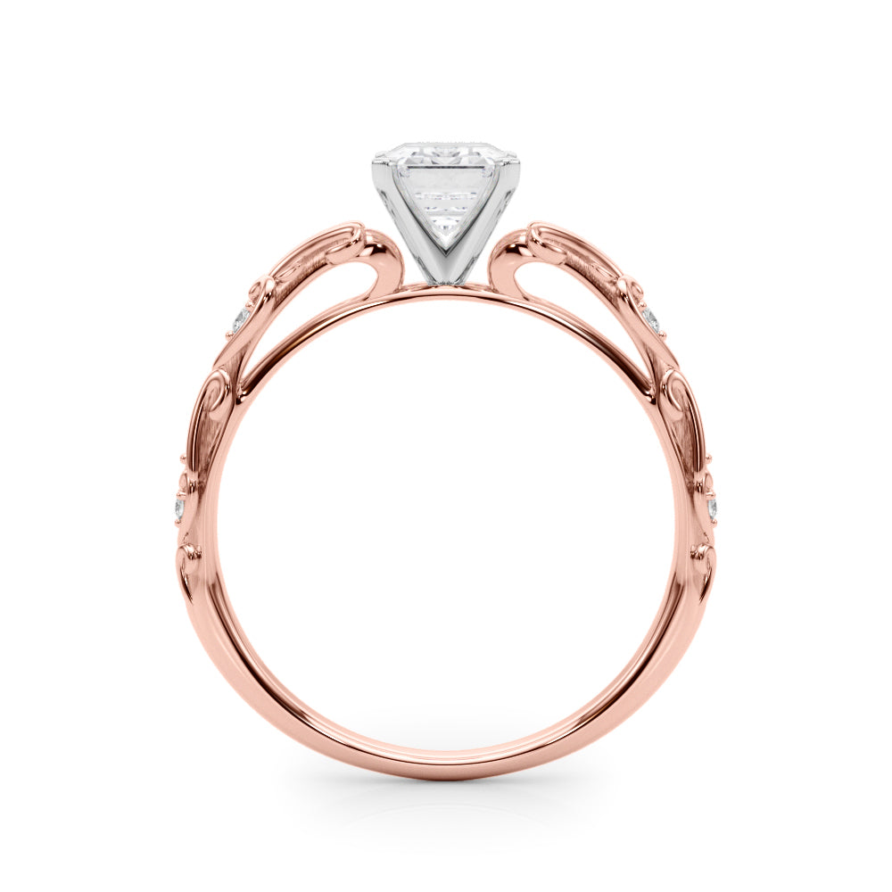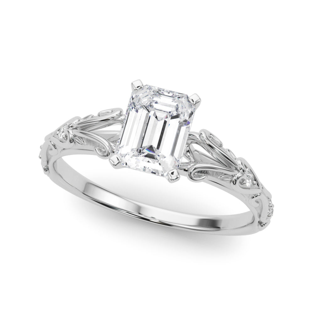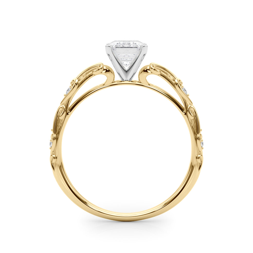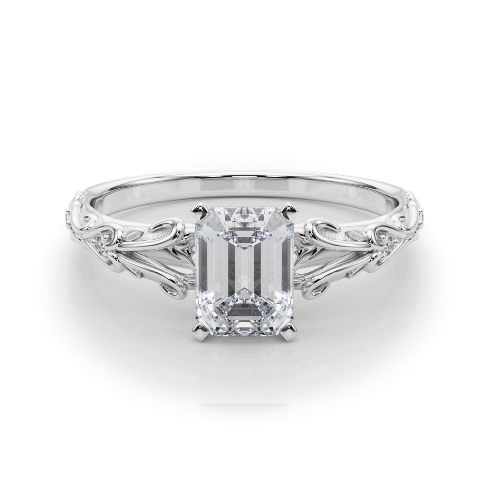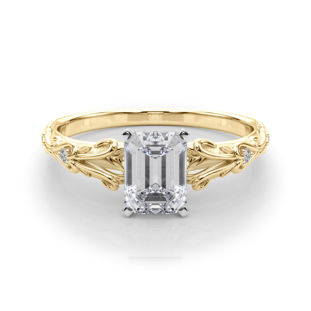 This exquisite ring features a stunning emerald-cut diamond as its centerpiece, set in a luxurious yellow gold band. The central diamond is elegantly elevated, allowing light to pass through and enhance its brilliance. The band is intricately designed with delicate leaf-like engravings, adding a touch of vintage charm and sophistication. On either side of the central diamond, there are two smaller round diamonds embedded within the ornate design, adding subtle sparkle and complementing the central stone. The combination of the classic emerald-cut diamond with the intricate detailing on the band makes this ring a perfect blend of timeless elegance and modern artistry.